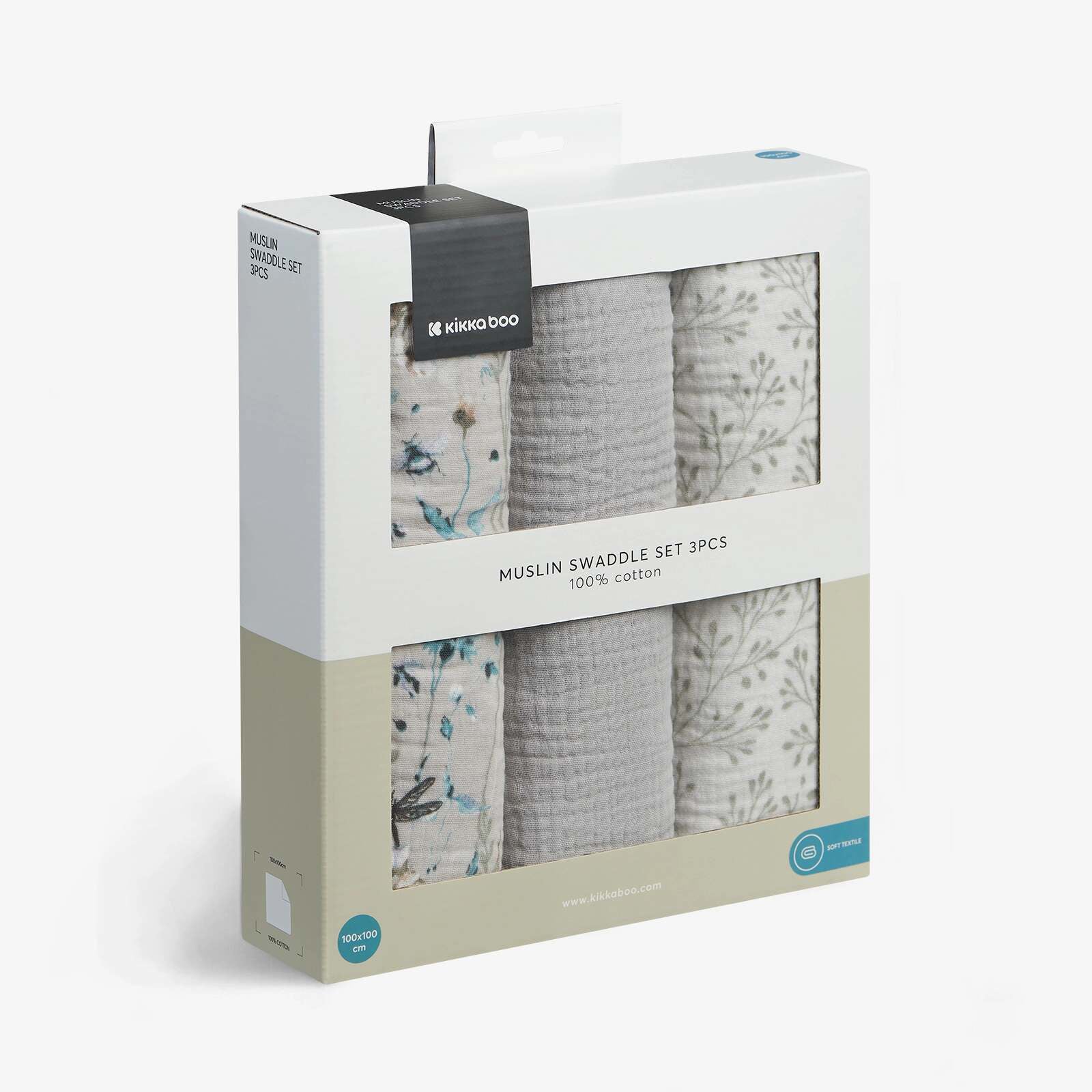 KikkaBoo® Muslin swaddle set 3 pcs 100x100 cm Dreamy Fields Grey