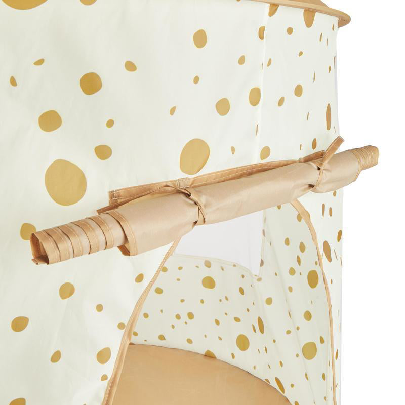 This foldable pop-up tent sets up in seconds and can be stored away compactly, making it an ideal companion for little adventurers both indoors and outdoors. Made from durable polyester, the Dots tent is robust and easy to clean. Bieco's Dots collection features warm caramel tones that transform any child's room into a cozy haven.