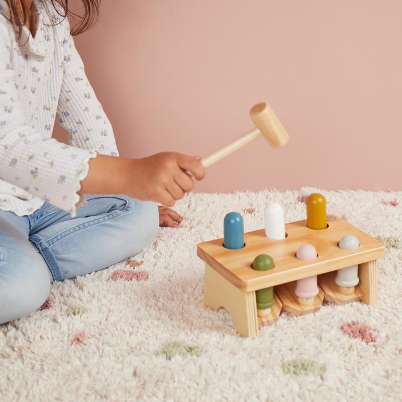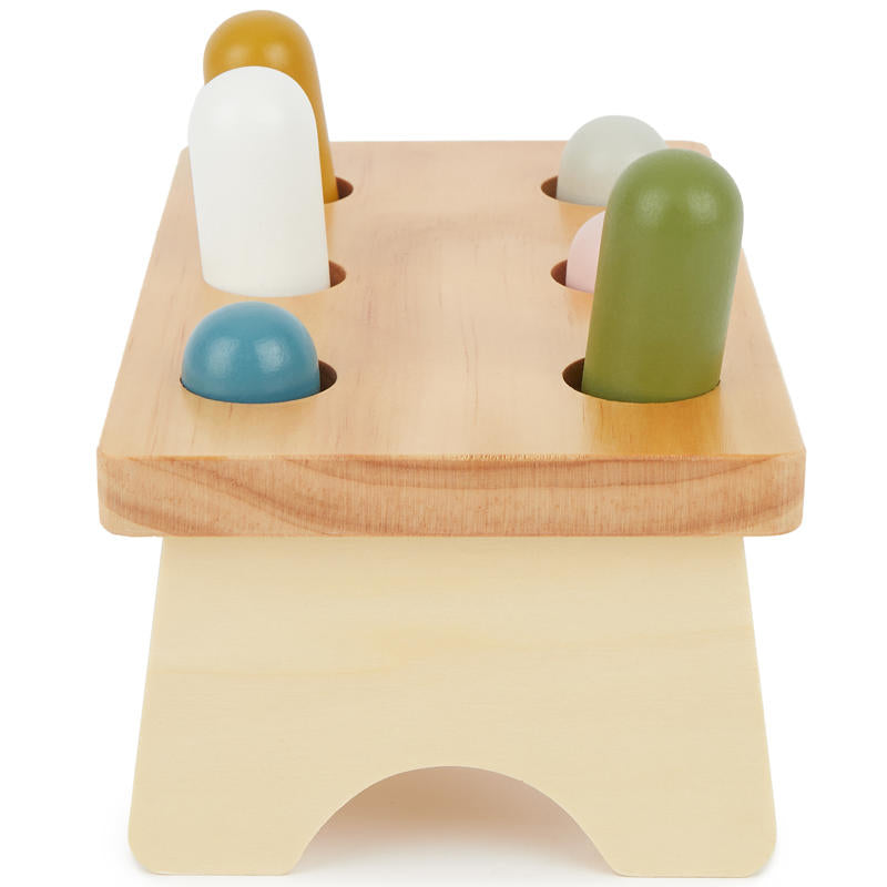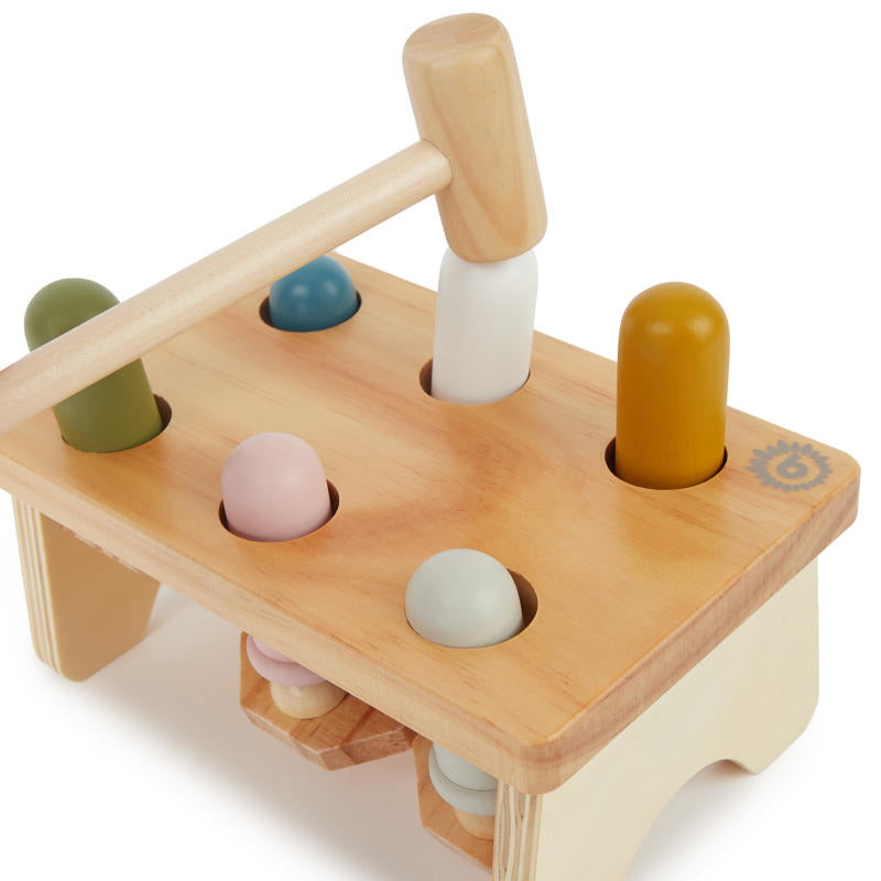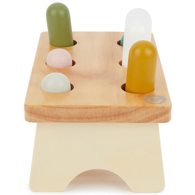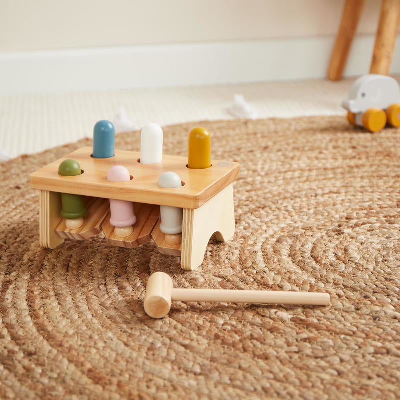 The bench includes 6 vibrant wooden pegs and a matching hammer for pounding them through the holes. A toy that encourages focus, patience and fun – again and again!