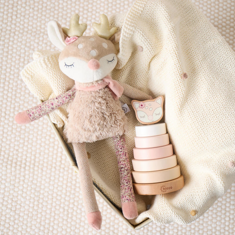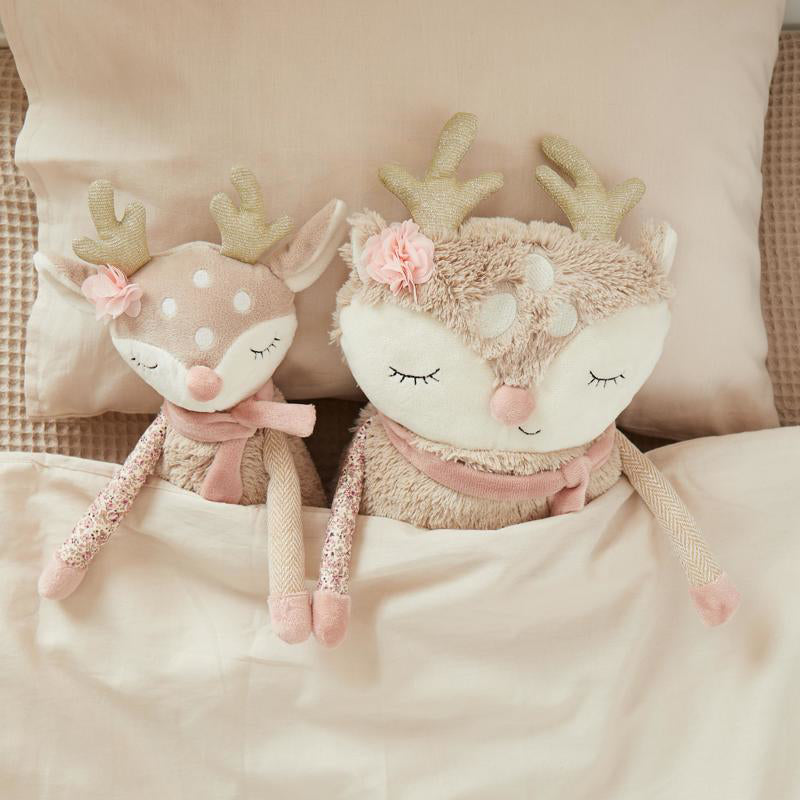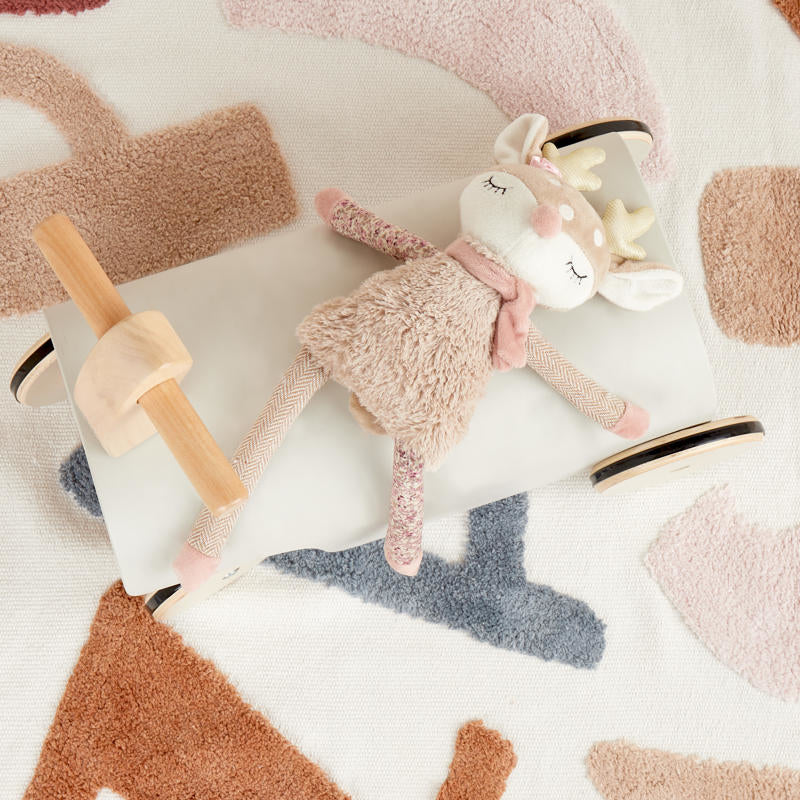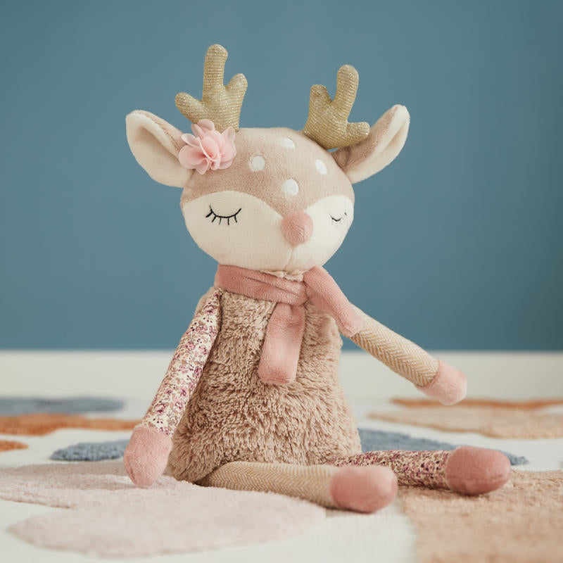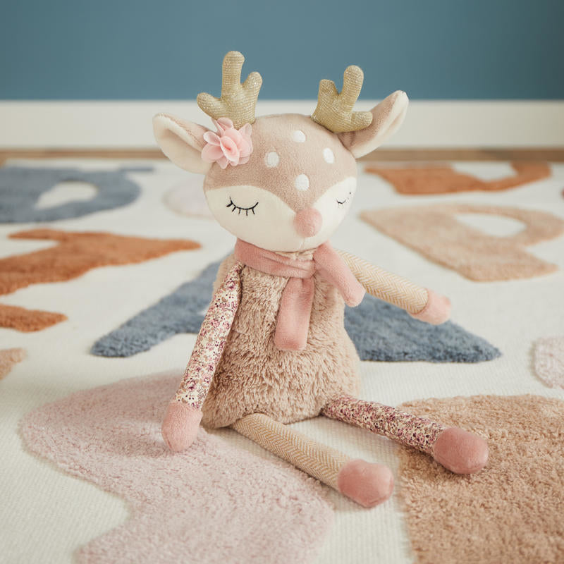 This adorable deer with her dreamy gaze will be a loyal companion for your baby at any time. Various fabric textures invite tactile exploration and gently stimulate sensory development. With its 44 cm size, it’s perfect for cuddling, snuggling, and comforting.