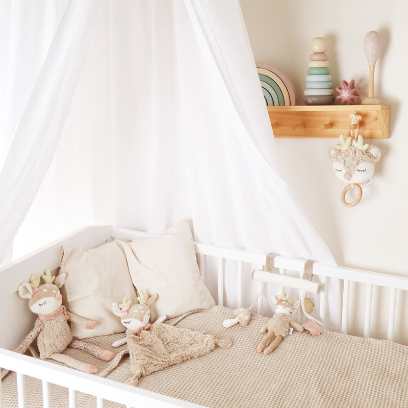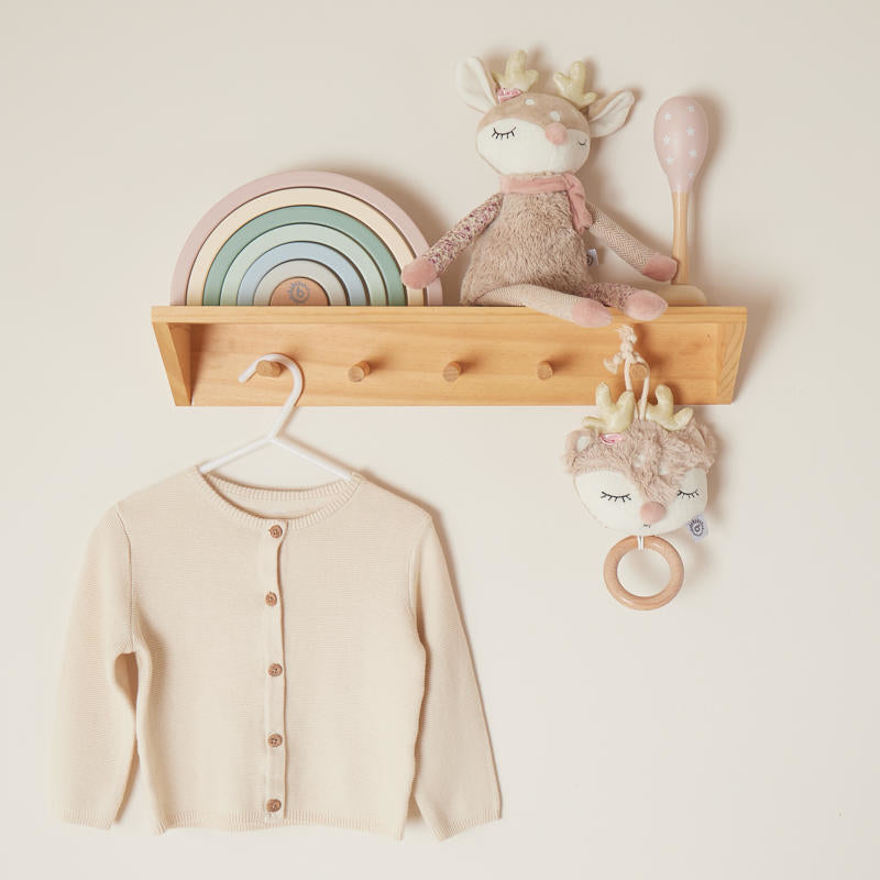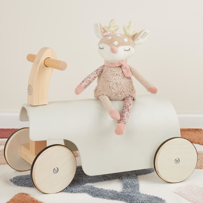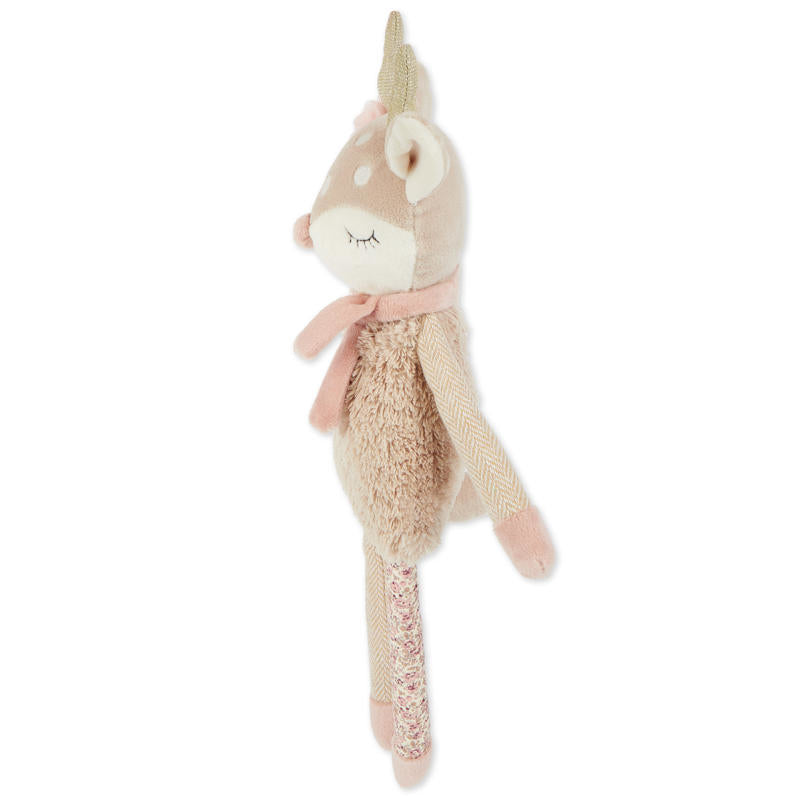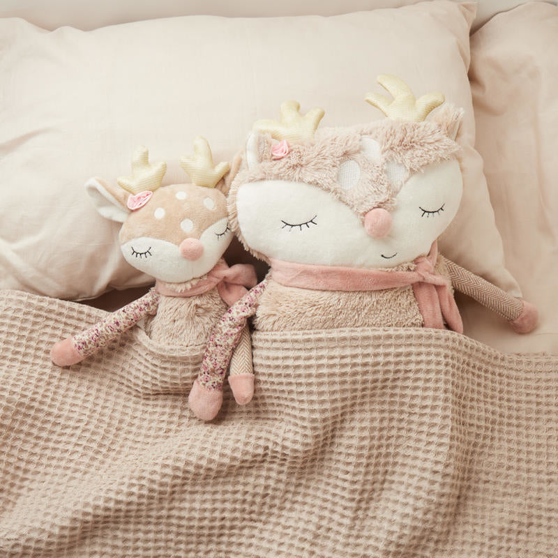 This adorable deer with her dreamy gaze will be a loyal companion for your baby at any time. Various fabric textures invite tactile exploration and gently stimulate sensory development. With its 44 cm size, it’s perfect for cuddling, snuggling, and comforting.