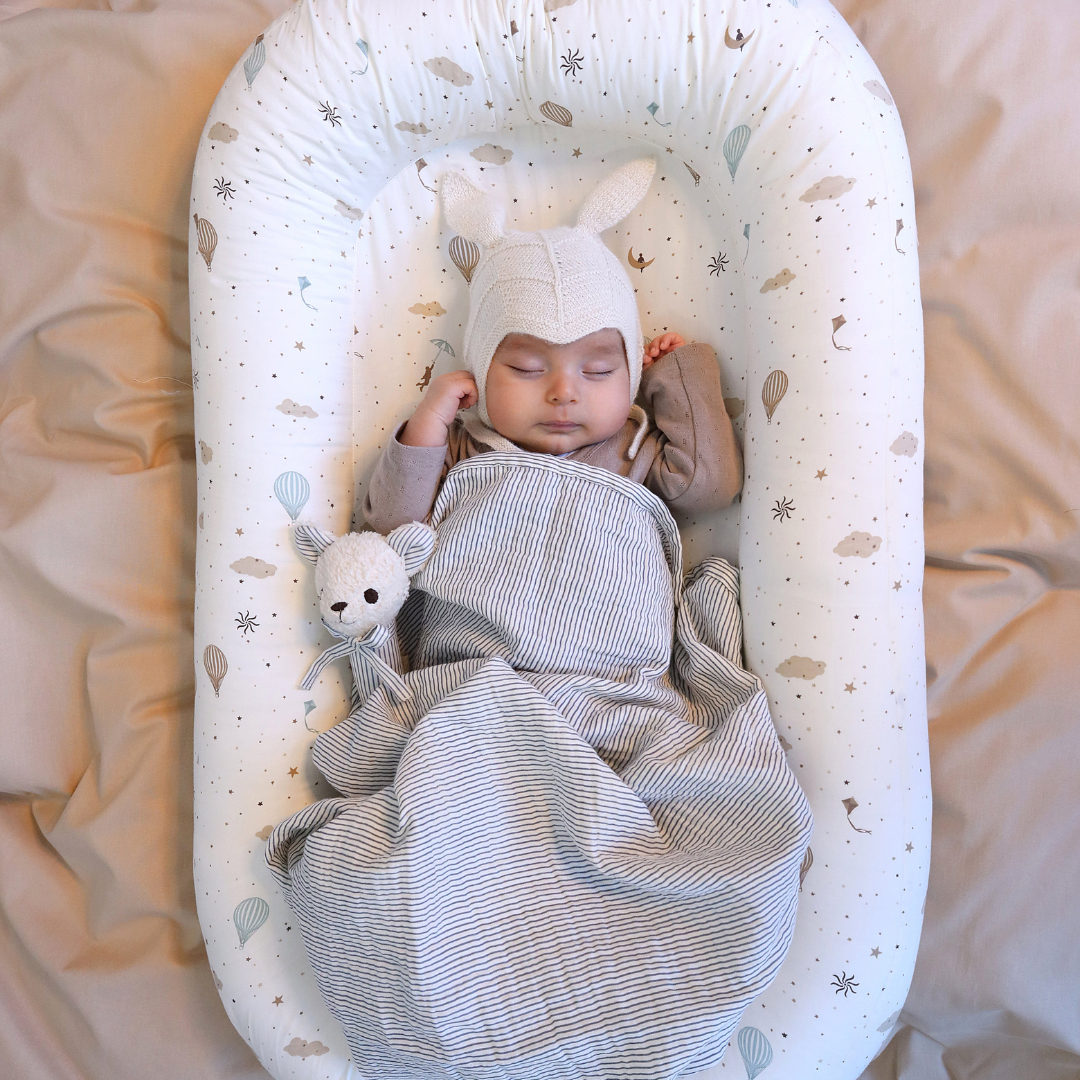 The baby nest can be used on the sofa, in the crib, on your double bed or when travelling - the four practical carry straps and the wooden piece at the bottom provide stability and firmness, so it is easy to move your sleeping baby.