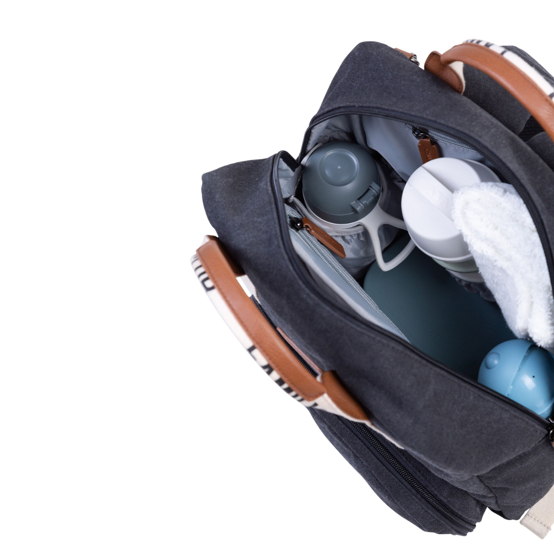 It is equipped with two large compartments and nine smaller ones. A zipper pouch allows you to store dirty clothes when needed. Additional smaller pouches make it possible to safely store your baby’s soother as well as your own wallet and keys. Two cooling pouches will keep your drink and snacks fresh during the day. Should your little one make a mess during lunch, the pouch in front of the bag especially designed for wet wipes will come in extra handy. It is very easy to access so you will never have to search for wet wipes again! And of course, the changing mat is also included.