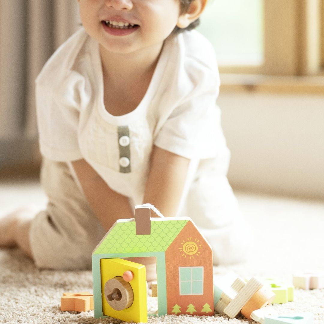 Children use a wooden key to unlock and lock the doors by matching the key to the correct shapes. The set includes 11 pieces, offering variety and extended playtime.