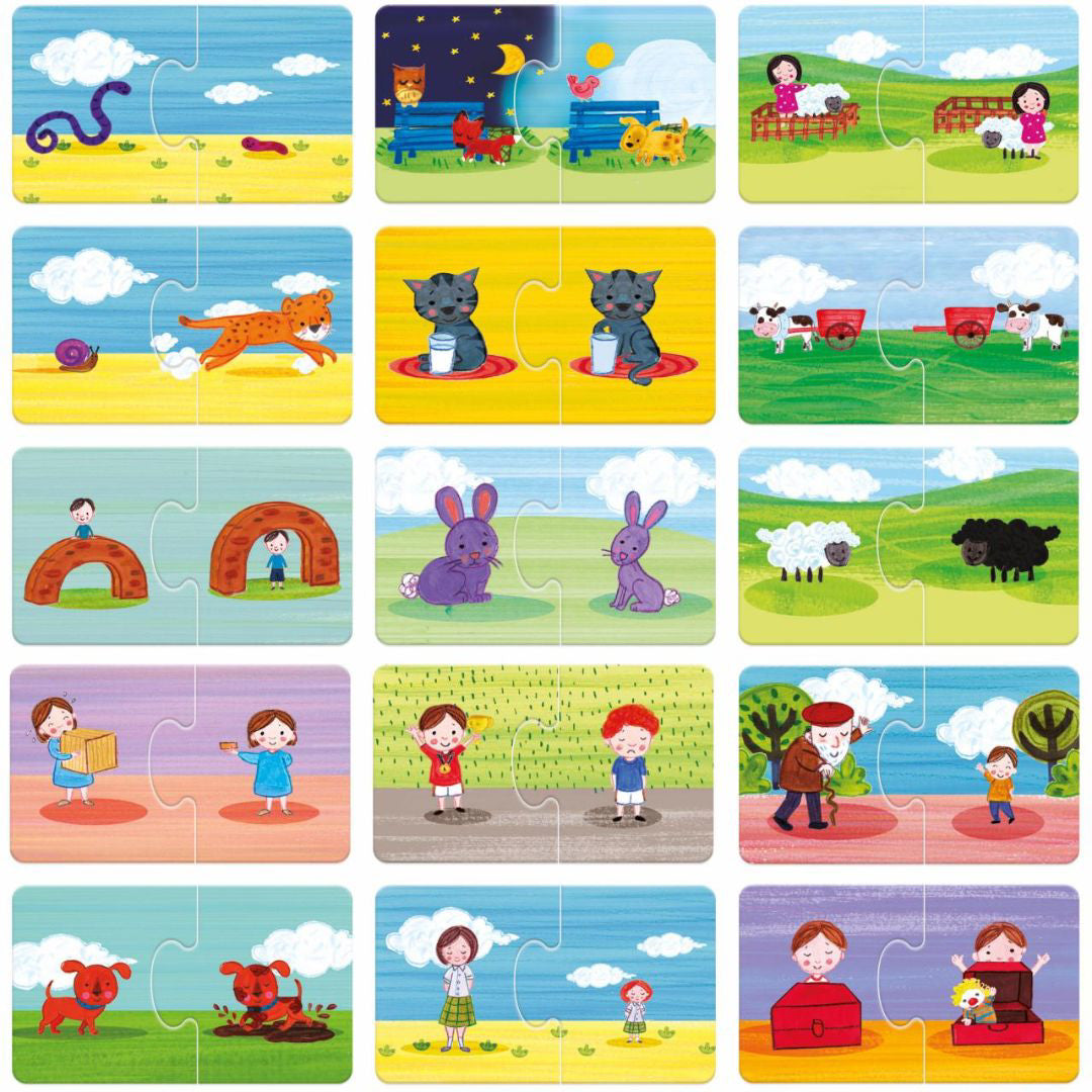 Sheep in the pen, sheep outside. Or perhaps inside and outside? Front or back? Preschool age is crucial for language development, and Headu puzzles are a perfect tool for this. Through the game, children encounter opposites and prepositions, connecting familiar experiences with new, unknown ones. Fun illustrations encourage observation, comparison, and forming first concepts of opposites.