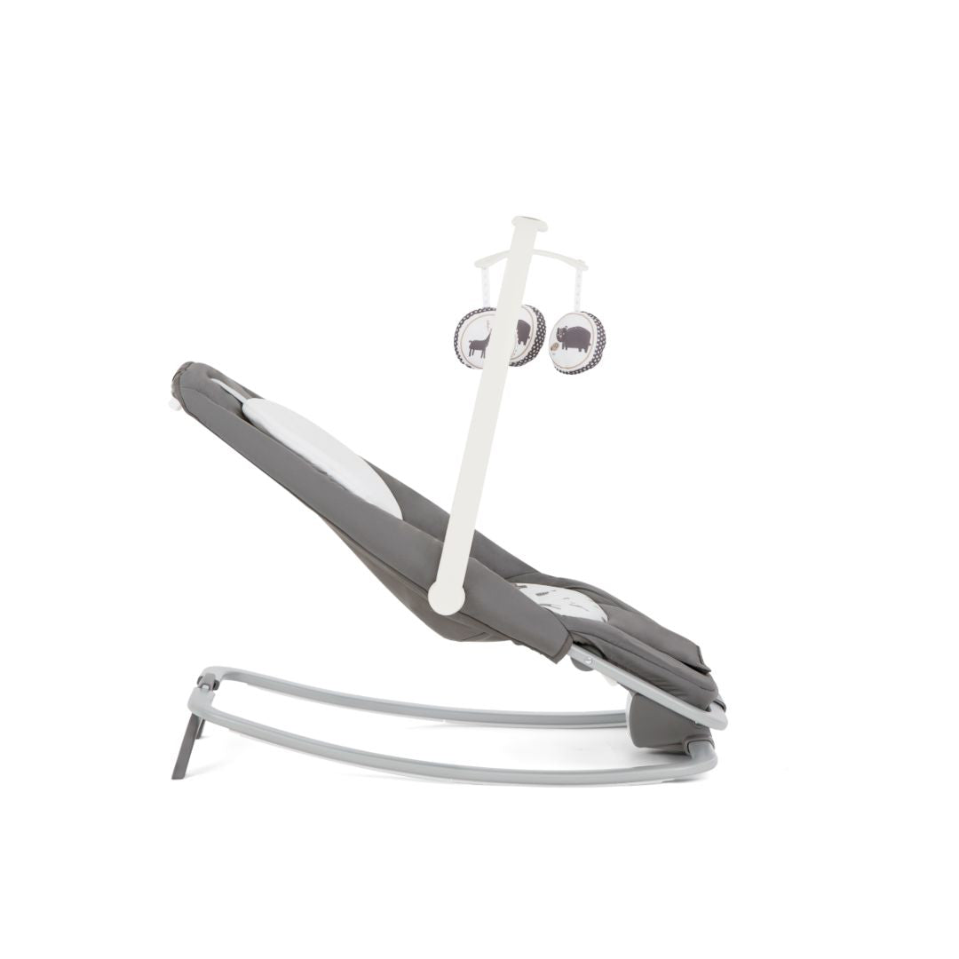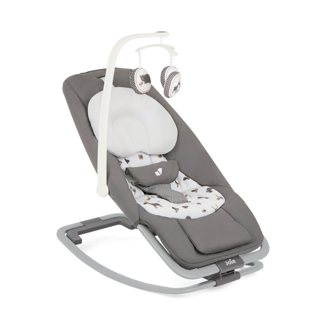 The Joie® Dreamer™ is designed for hassle-free maintenance. The frame can be wiped clean with a damp cloth, and the fabric cushion is machine-washable (follow care instructions on the labels). The package includes everything you need: the rocker with soft padding and a newborn insert, a safety harness, a toy bar, and a set of hanging toys. The toy bar folds flat with the rocker for compact storage. While your baby enjoys watching the adorable hanging toys in a cozy environment, their sensory and motor development is stimulated, promoting brain activity and auditory-visual coordination.