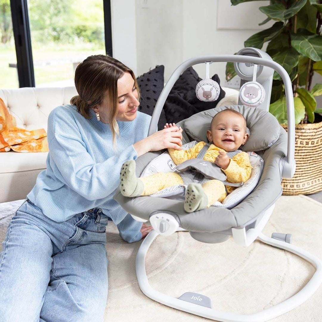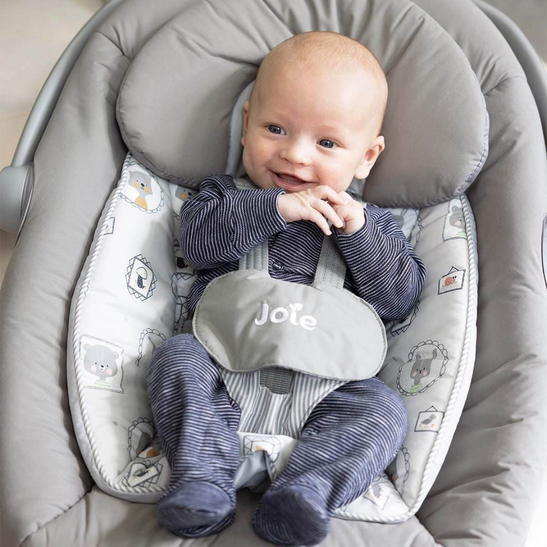 The Joie® Serina™ 2in1 baby rocker comes with everything you need: a soft padded seat with a newborn insert, safety harness, swing base, and soft hanging toys. The rocker handle also serves as a toy bar for attaching the included toy set. Your baby will enjoy observing the adorable hanging toys while comfortably resting in the rocker. From birth, it’s essential that babies are surrounded by objects and toys that stimulate cognitive activity and encourage motor skills, sound, and visual development. The refined design of the rocker and accessories ensures it fits seamlessly into any room in your home. The Joie® Serina™ 2in1 baby rocker has also received the Bounty Baby Awards: Gold.