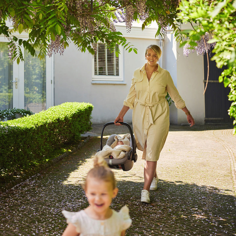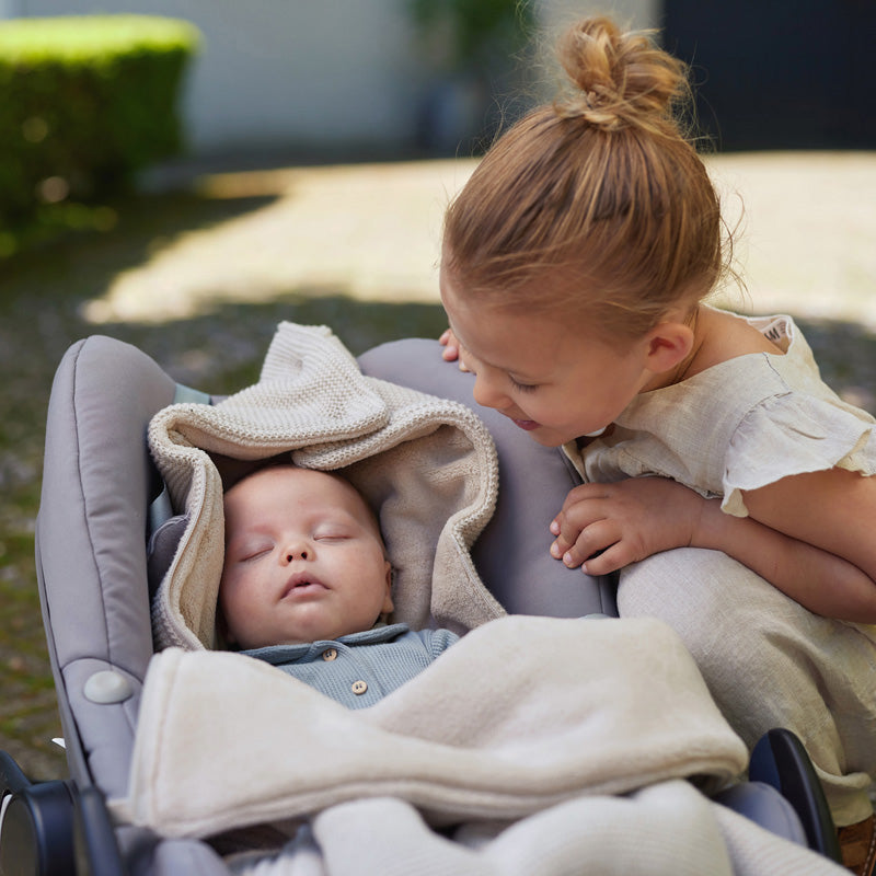 The knitted fabric on the outside of this footmuff gives it a chic look and the ultra soft fleece on the inside ensures that your baby is even more comfortable. A footmuff is really a godsend. You can easily put your baby in the footmuff by first unzipping the bag completely. You can also easily remove your baby from the car seat by unzipping the footmuff completely. You can quickly make a hat from the top with one push button, so that the head also stays warm as soon as you wear the car seat outside or take a walk. To ensure that your baby does not get too hot in the car, open the zipper of the bag as far as necessary. In short: a super handy comfort bag for your baby. The footmuff has openings in the back to make it extra easy to fasten the belts. It is a universal footmuff for the Maxi Cosi and any other brand of category 0 car seat with three or five point belts. You can also use this comfort bag in the pram. Your baby will be warmly wrapped for the walk in no time.