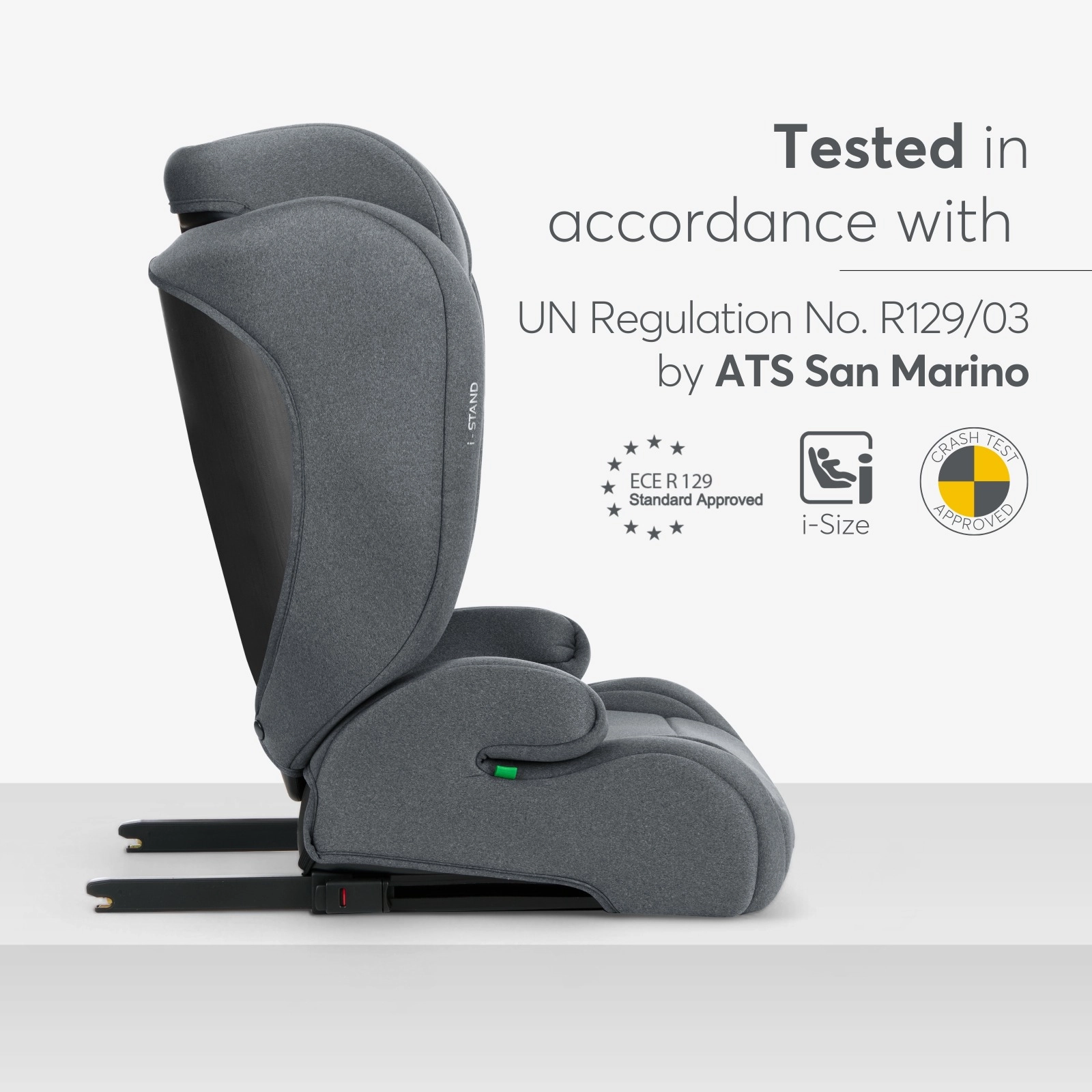 The i-Stand i-SIZE car seat is tested and certified under UN Regulation No. R129/03 by ATS San Marino, providing the highest level of safety assurance for your child.