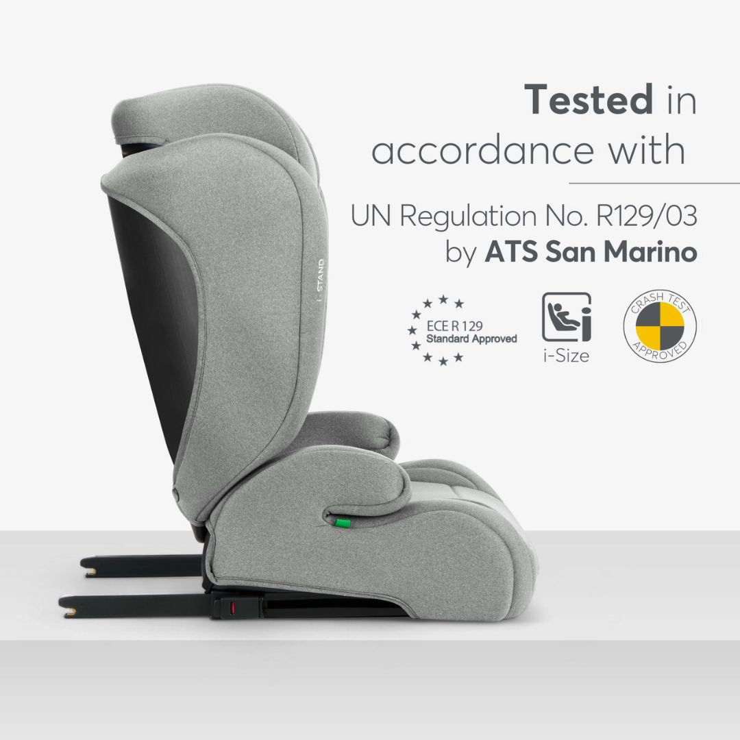The i-Stand i-SIZE car seat is tested and certified under UN Regulation No. R129/03 by ATS San Marino, providing the highest level of safety assurance for your child.