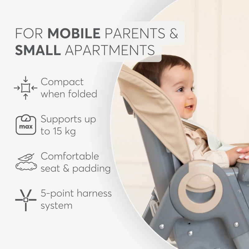 The Comfy high chair is a practical and stylish choice for parents who want to provide their child with a comfortable and secure space for feeding. Suitable for children who can sit up unaided, up to approximately 3 years old or a maximum weight of 15 kg. Thanks to its compact folding design, it is easy to store and transport.
