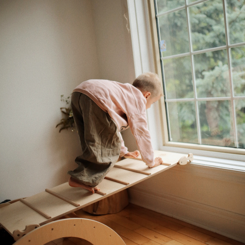 Each of our Pikler accessories is compatible with the others, and secure locks connect the system's pieces safely and effectively while holding them in place. Link them together in a variety of ways to create your very own play ground — designed just the way you like! You can switch it up daily to explore new challenges and create unique obstacle courses. Each (accessory, furniture, TBD) is finished with a water-based varnish for smooth, comfortable play and easy cleaning.