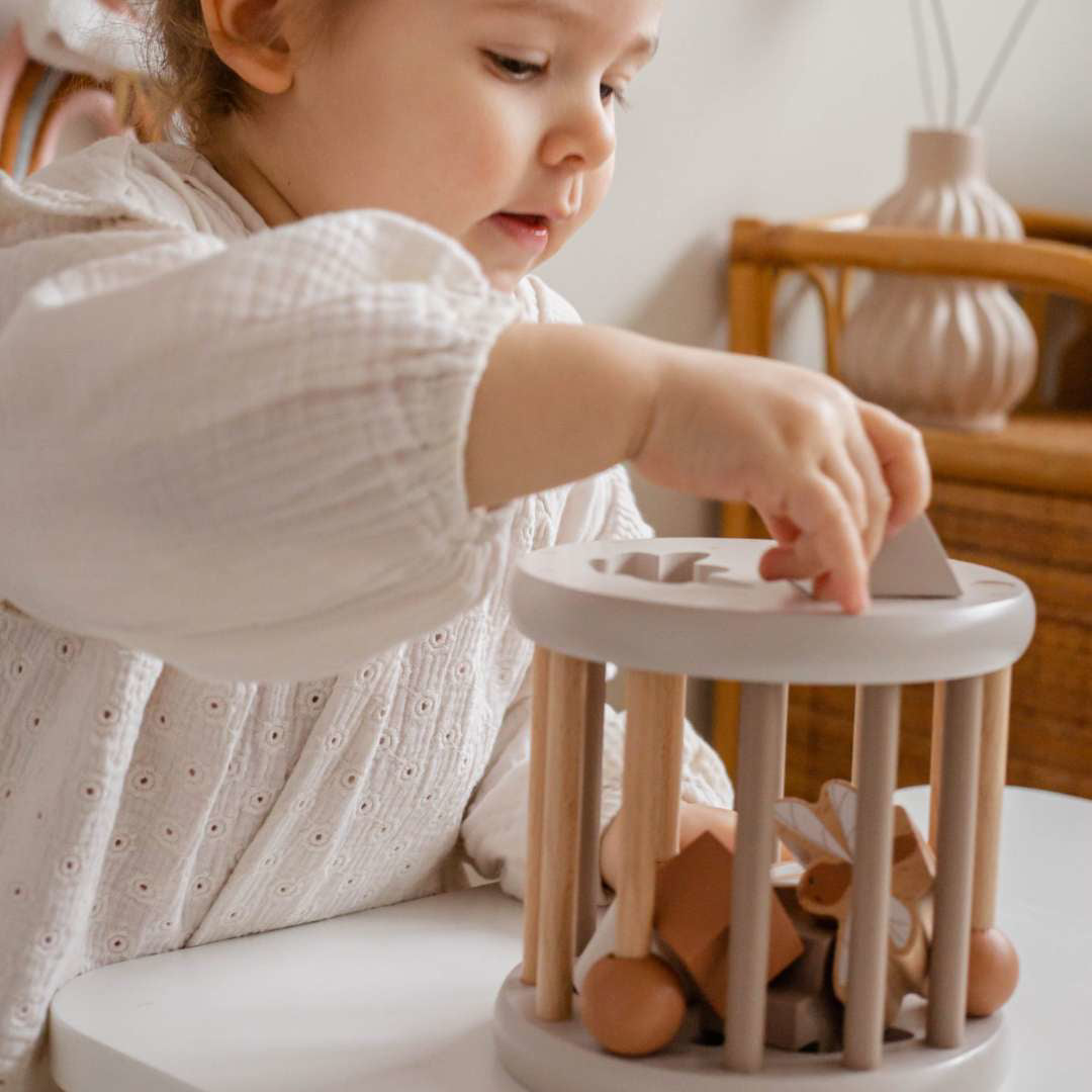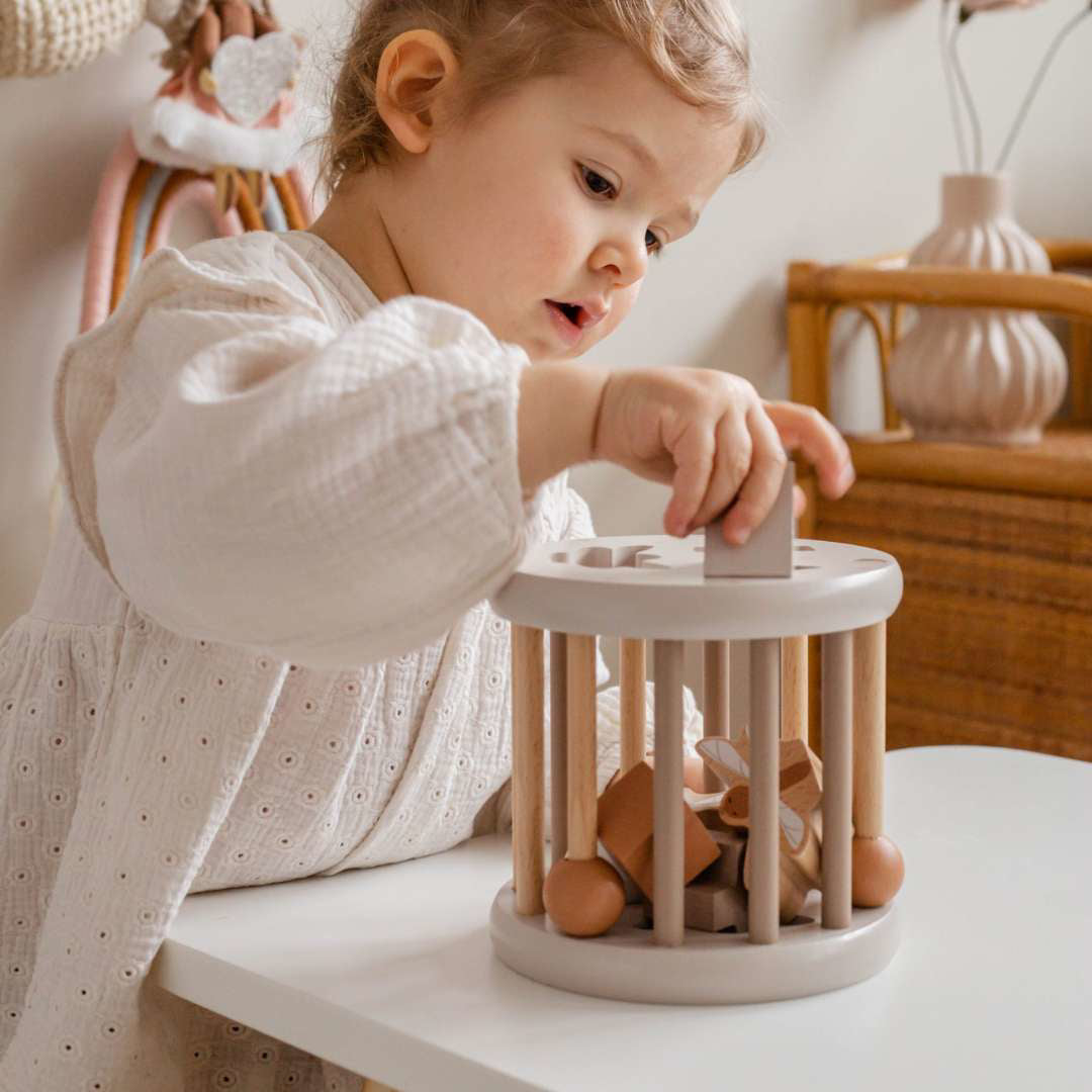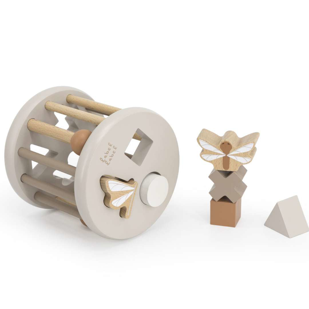 The Label Label® wooden activity roller is a perfect toy for stimulating fine motor skills and recognizing shapes and colors. The roller includes 6 geometric shapes such as circle, triangle, rectangle, and heart, which children insert into matching openings.