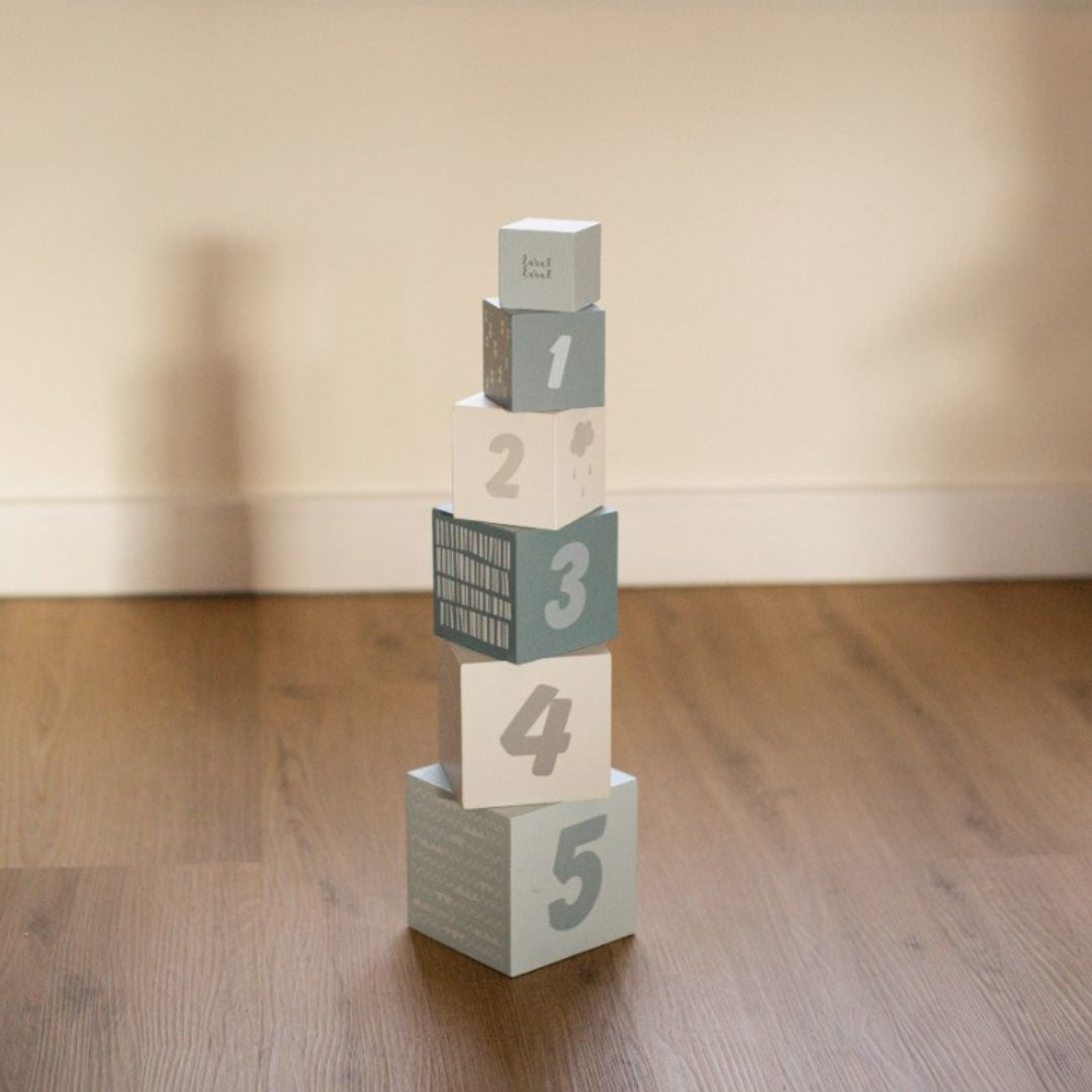 The set includes 6 blocks of different sizes, which children can stack or nest inside one another. Each block has numbers on two sides and charming patterns and illustrations on the others, promoting number recognition, logical thinking, and hand-eye coordination.