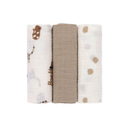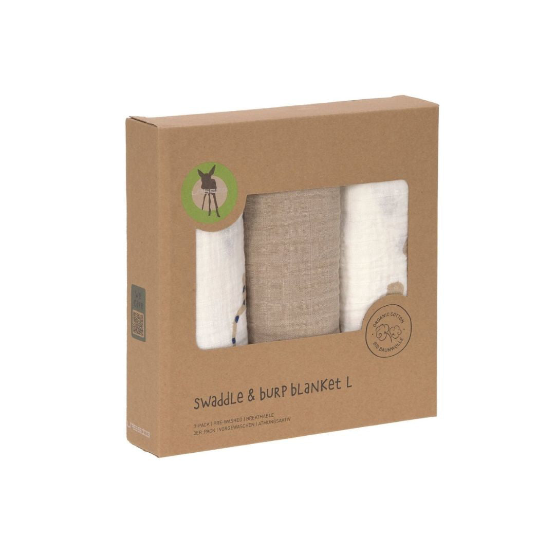 The swaddle and burp cloth features a friendly and cheerful printed motif and comes in a convenient three-pack with various color combinations. Its exceptionally soft fabric is gentle on baby’s delicate skin, ensuring maximum comfort during use.