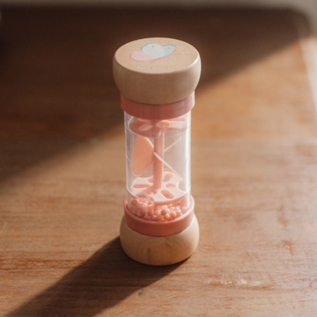 Shake and rattle! Turn the rain rattle and the dripping beads will move to the other side, creating soothing sounds of raindrops. Perfect for the sensory development and musical talent of your little ones. The beads in 3 different colors fall down the tube through small openings and cause the propeller to spin, creating a pleasant sound. The rain rattle is designed for small hands and allows for an easy grip. The wooden top and bottom are illustrated with a seagull from the Fairy Garden collection.