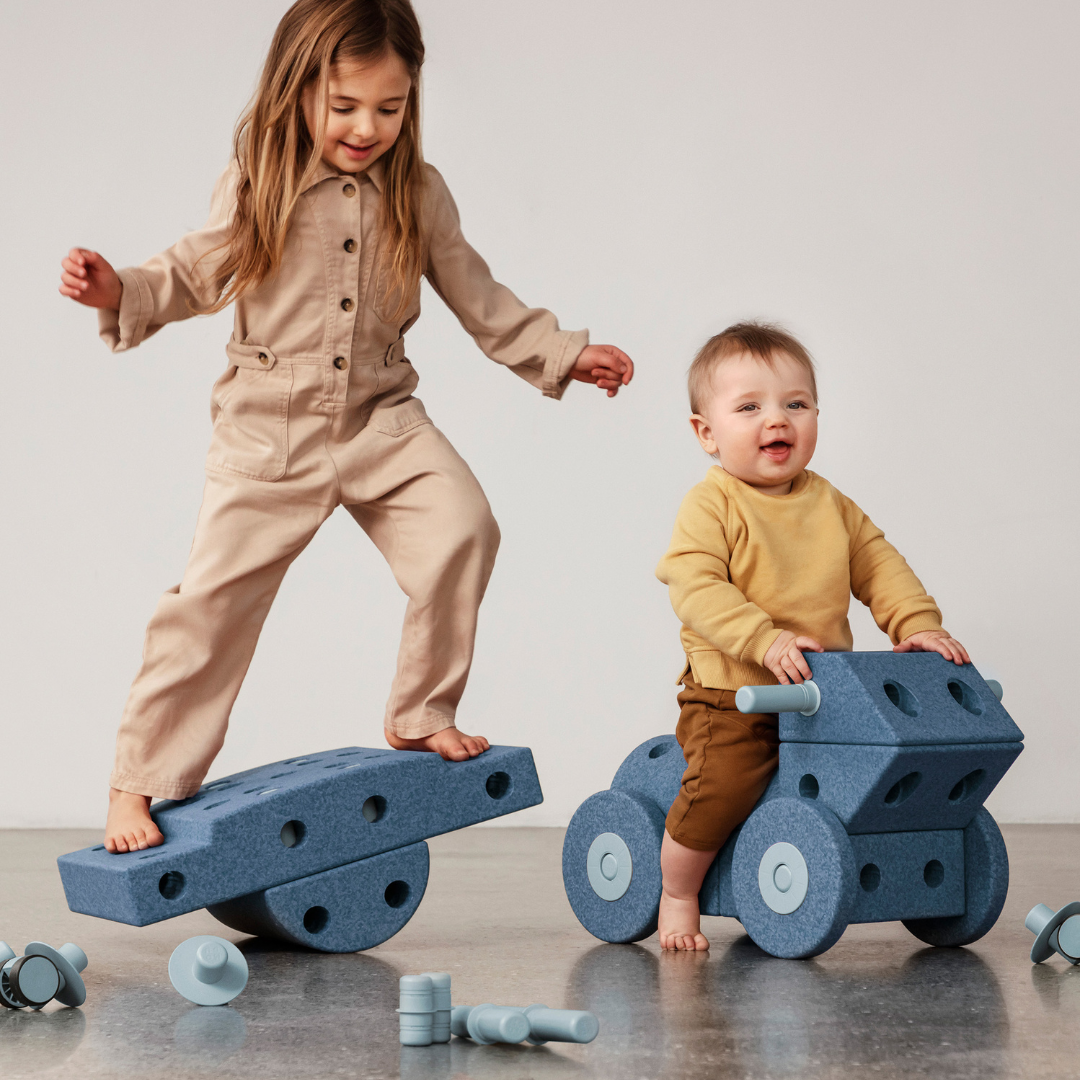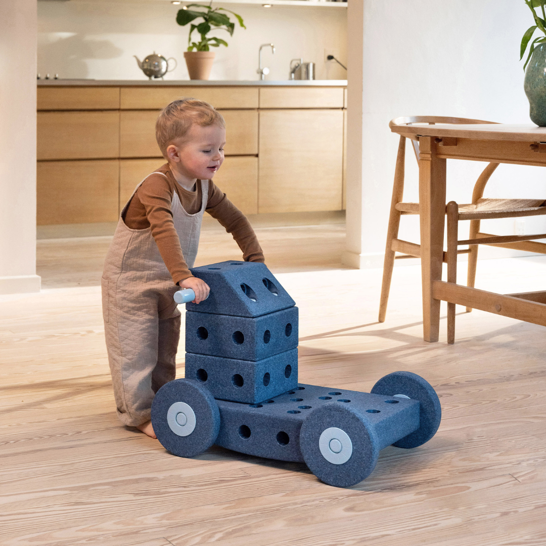The blocks are made of 100% recycled EPP foam, resistant to damage, dirt, and wear. Connectors and wheels are made from 100% recycled, non-toxic ABS plastic safe for food contact.