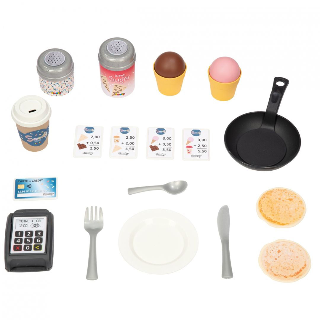 - 18 accessories included: plate, fork, knife, spoon, mug with lid, pancake pan, 2 pancakes, sugar pot, sprinkles jar, 2 ice creams, 4 receipts, card reader, and a credit card