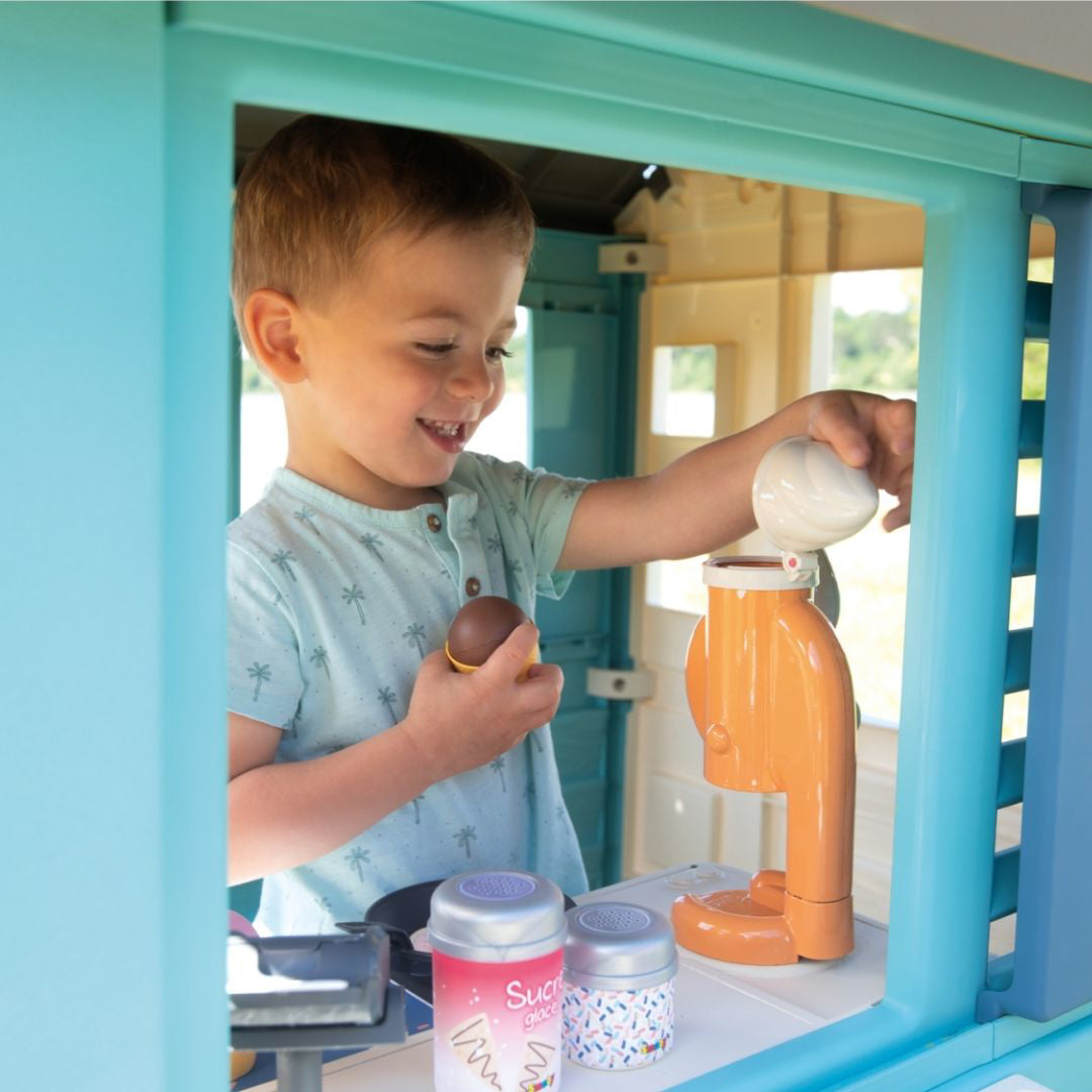 The Sweety Corner playhouse is perfect for little pastry chefs and hosts who want to invite friends over for pancakes, ice cream, or a refreshing drink. Equipped with a half door, two windows with shutters, and a sliding shutter, it creates a magical spot for imaginative roleplay.