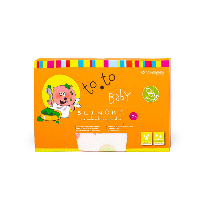 Slinčki so namenjeni zaščiti malčkovih oblačil med hranjenjem. So enostavni za uporabo – vrhnja konca slinčka se samo zlepita skupaj. Imajo praktičen žepek za hrano, ki je globok 5 cm. Primerni so za otroke od rojstva naprej. Idealni so za uporabo doma in na poti – po uporabi jih preprosto zavržete. Izdelani so iz visoko vpojnega, nepropustnega in higieničnega materiala. V paketu je 10 slinčkov.