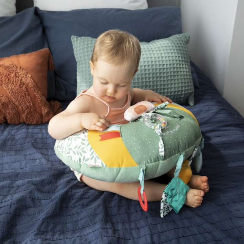 - Sitting, the cushion is placed on baby's lap thanks to its ergonomic shape.