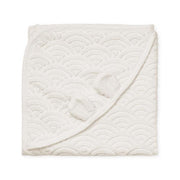 Une serviette de bain douce, luxueuse et épaisse pour bébé, tissée en jacquard selon le motif classique des vagues Cam Cam. La serviette a une capuche confortable et est parfaite pour se blottir après un bain chaud.