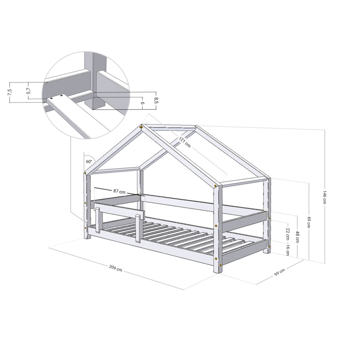 Napravljen je po Montessori filozofiji, tako da se u njoj svaki mališan osjeća sigurno i uživa u odmoru. Krevetić je ručno napravljena od drveta debljine 60 mm. Ogradicu možete jednostavno pričvrstit ili ukloniti.