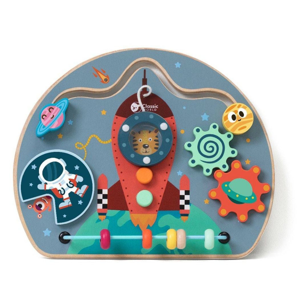 Umirujuće boje i simpatični motivi privući će dijete na igru. Aktivnosti poput okretanja kotačića, pomicanja svemirskog broda i malog astronauta te vrtlog astronauta pomoći će u razvoju finih motoričkih vještina i koordinacije.