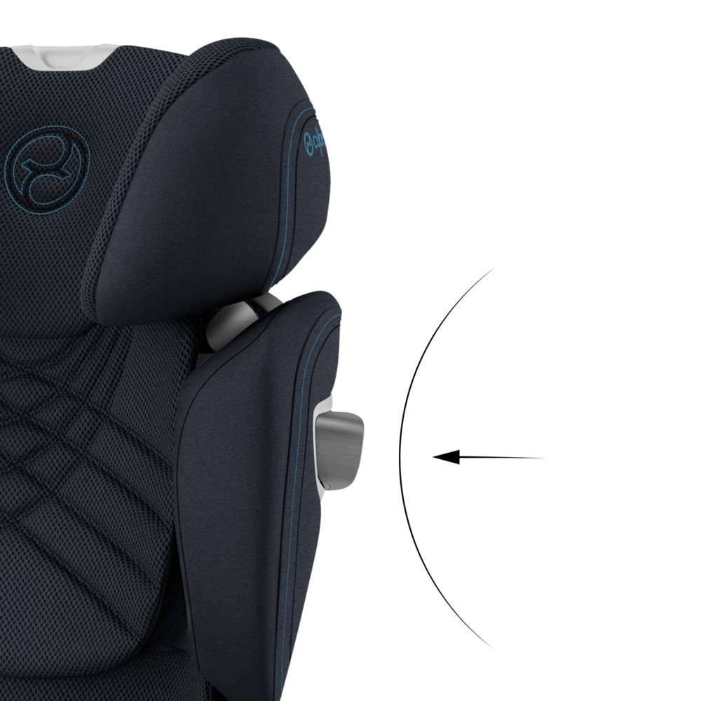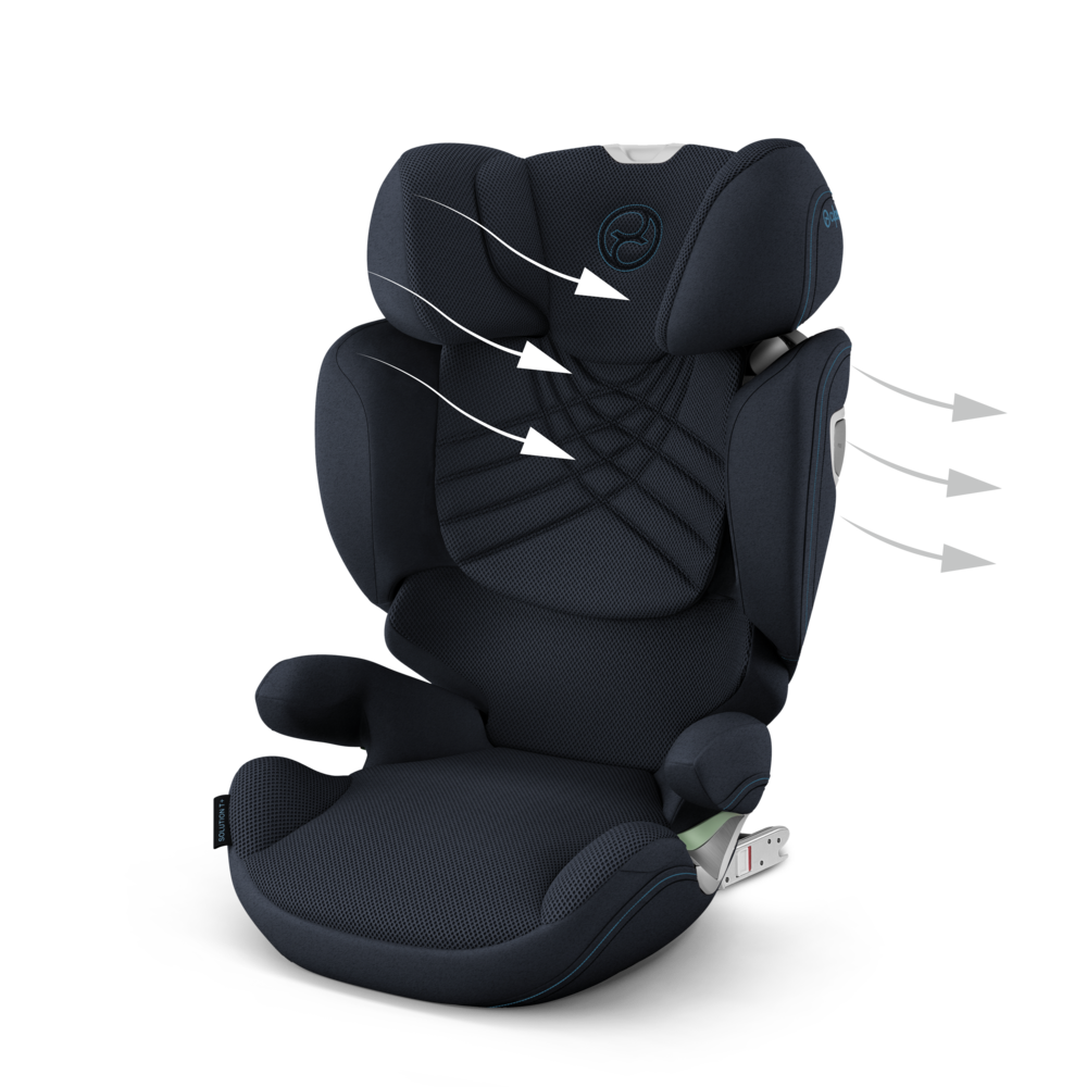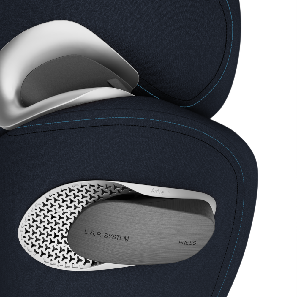 Autosjedalica Cybex® Solution T i-Fix 2/3 pruža visoku sigurnost djeteta na putu. Sustav zaštite L.S.P. plus, koji je ugrađen u bočne strane naslona za glavu, pruža 20% manji pritisak na djetetovo tijelo u slučaju bočnog sudara. Sustav apsorbira snagu udarca u linearnom nizu reakcija. Glava djeteta učinkovito se vodi u siguran položaj zahvaljujući patentiranoj nagibnoj potpori za glavu.