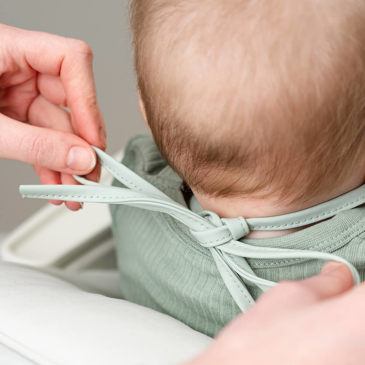 Vezalke za zavezovanje omogočajo, da se slinček zlahka prilagodi in udobno namesti okrog vratu. Zaradi svoje kompaktne velikosti je odlična izbira za dojenčke in prve prehranske pustolovščine.