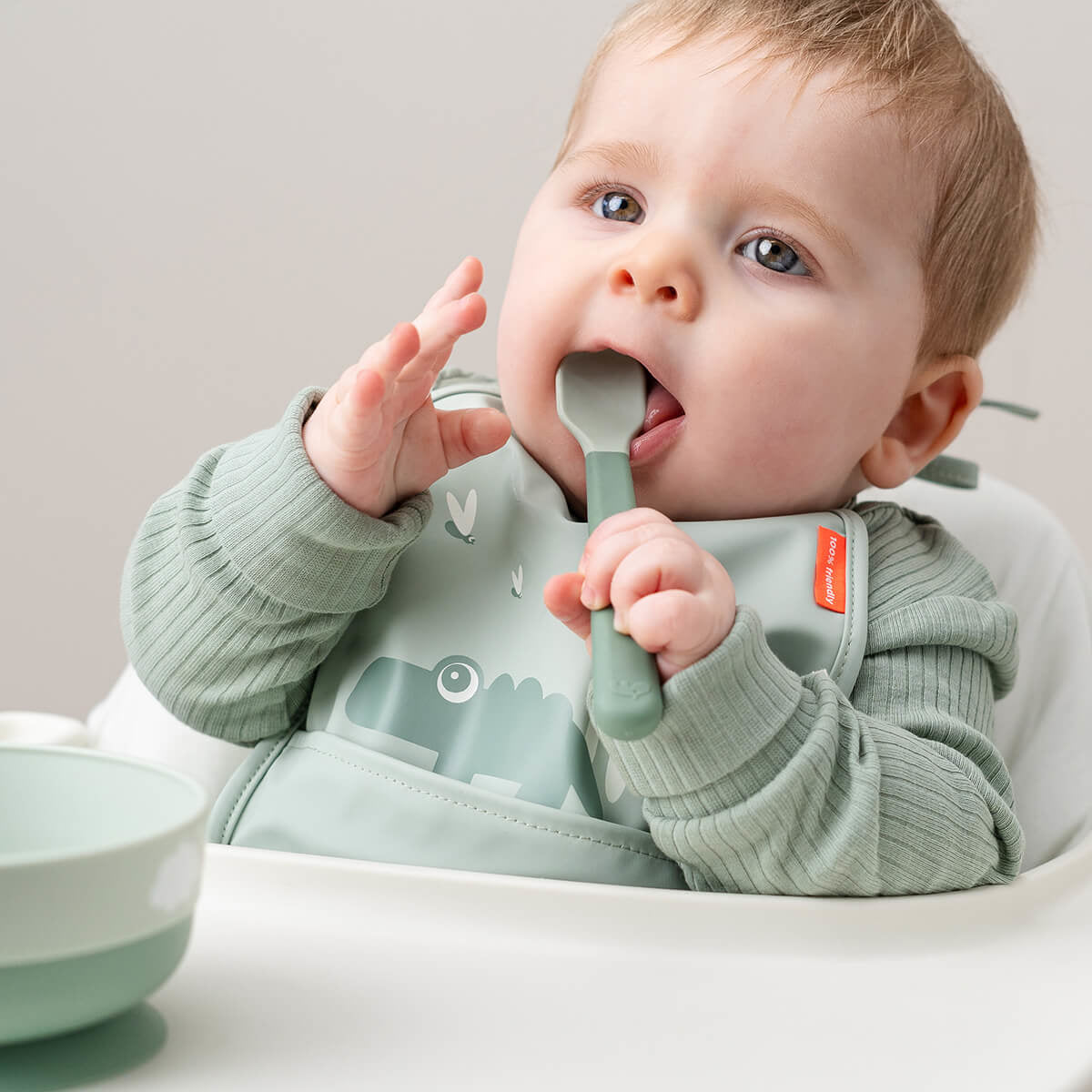 Praktičen komplet dveh majhnih vodoodpornih slinčkov je popolna izbira za prve obroke. Žep na spodnjem delu ujame drobtine in koščke hrane, ki zgrešijo usta, vodoodporna površina pa omogoča enostavno čiščenje.