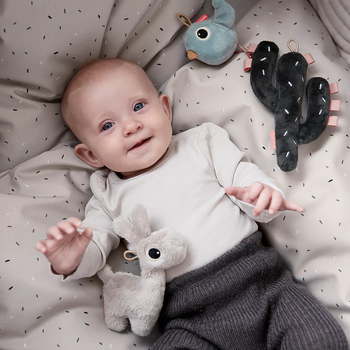 Vsaka igračka ima svoj zvok ali teksturo – Lalee je mehka in prijetna, kaktus oddaja mečkljive zvoke, ptiček Birdee pa ima zvonček, ki pritegne pozornost. Vse igračke so lahke in prilagojene malim rokam, zato so idealne za prve poskuse prijemanja in raziskovanja.