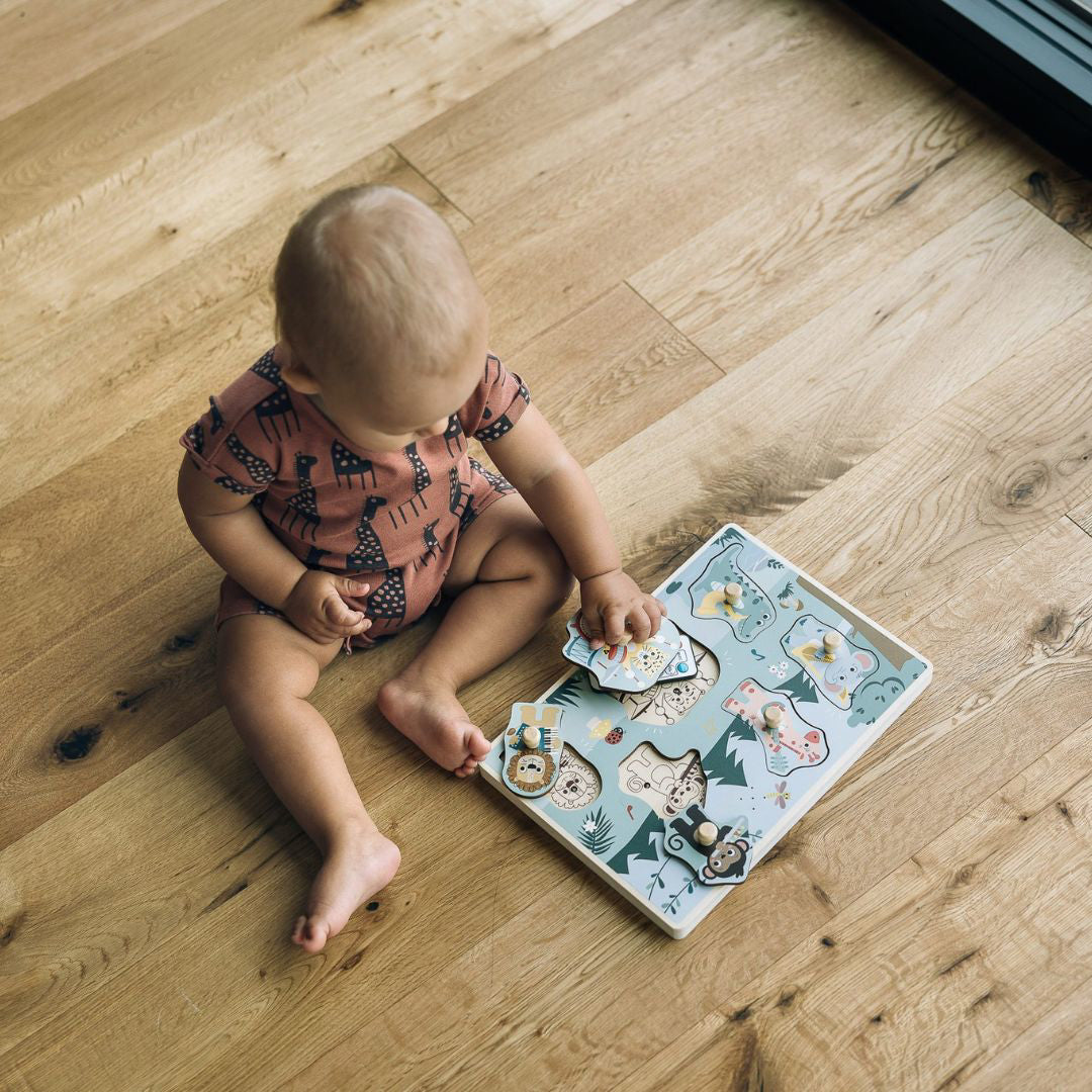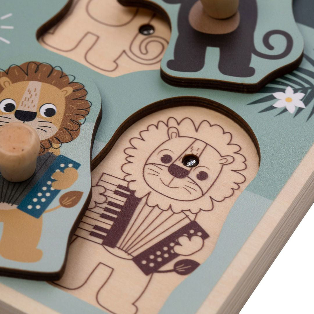 Odvedite svog mališana u divlji svijet džungle s drvenom zvučnom slagalicom koja spaja učenje i zabavu! Zvučna slagalica U džungli djeci na zabavan način predstavlja životinje iz džungle i njihove zvukove. Kada dijete pravilno postavi životinju na njeno mjesto, ona proizvodi svoj karakterističan zvuk, što oduševljava mališane i potiče njihovu znatiželju. Igračka također razvija finu motoriku, koordinaciju ruka-oči i prepoznavanje oblika.