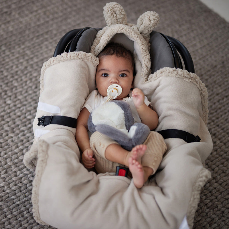 Dekica je napravljena od ekstra mekanog berberskog runa. Veličina dekice je 100 x 105 cm i ima dodatne otvore za lakše korištenje u autosjedalicu (od 0 do 9 mjeseci) .
