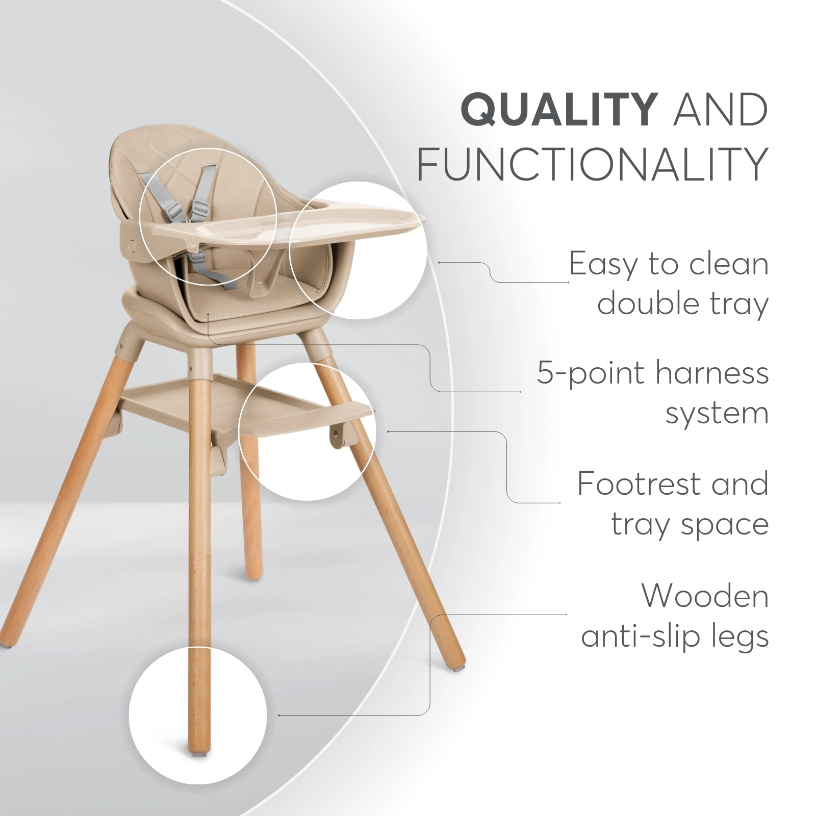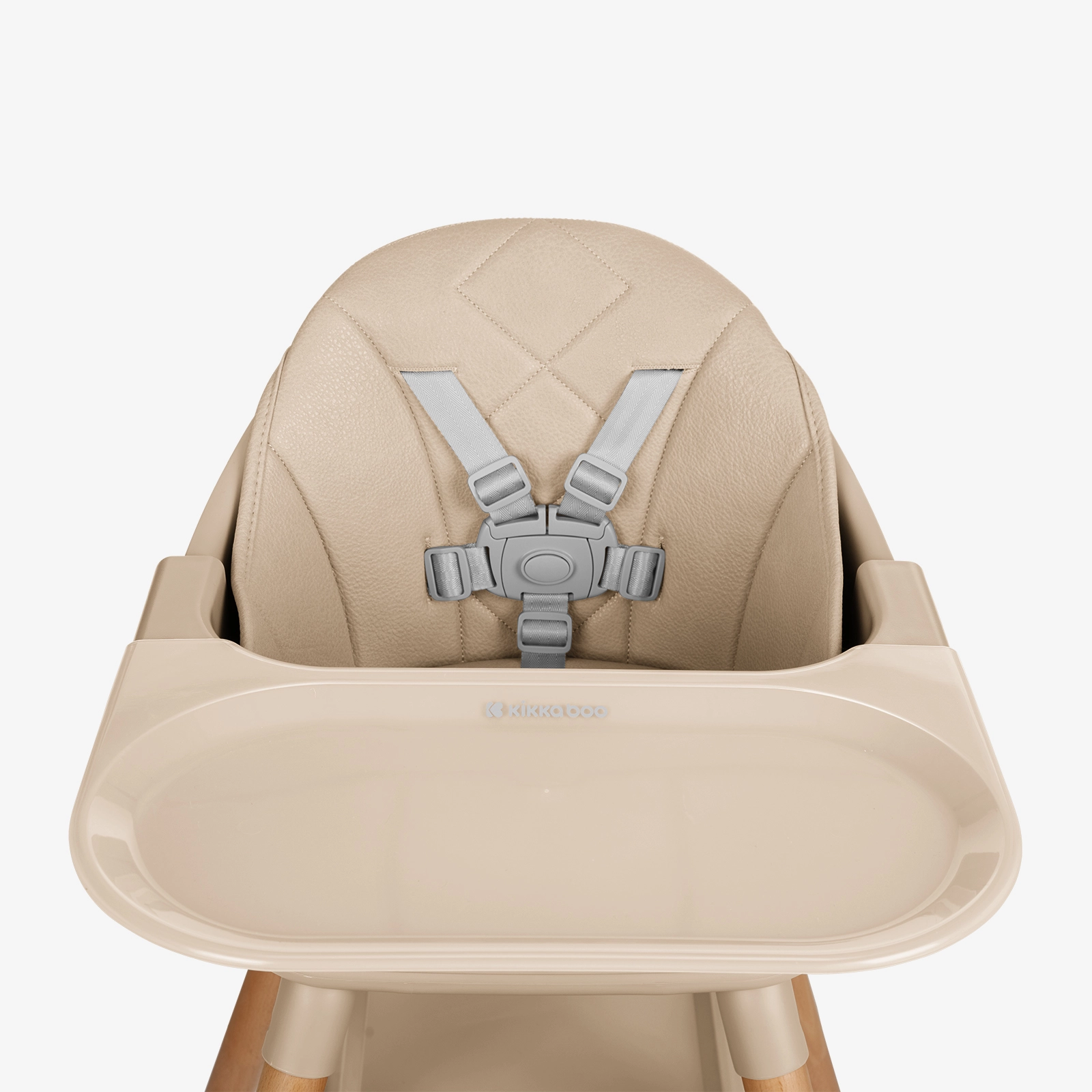Dvostruki pladanj nudi dodatni prostor, a mogućnost korištenja kao visoka ili niska hranilica čini je izrazito praktičnom. Presvlaka od prave kože i oslonac za noge pružaju dodatnu udobnost i lako čišćenje.