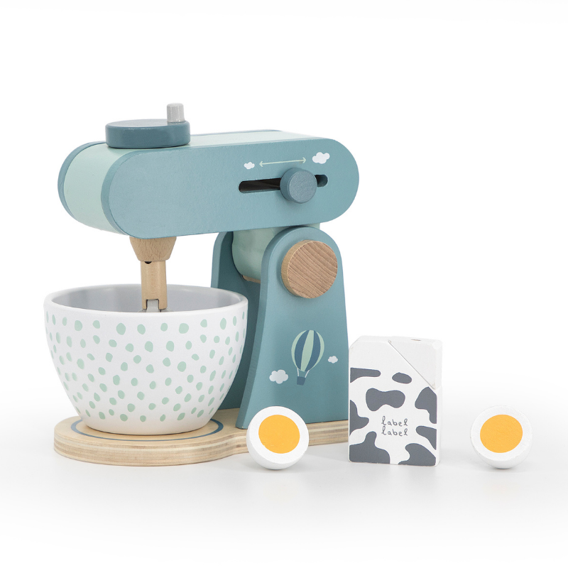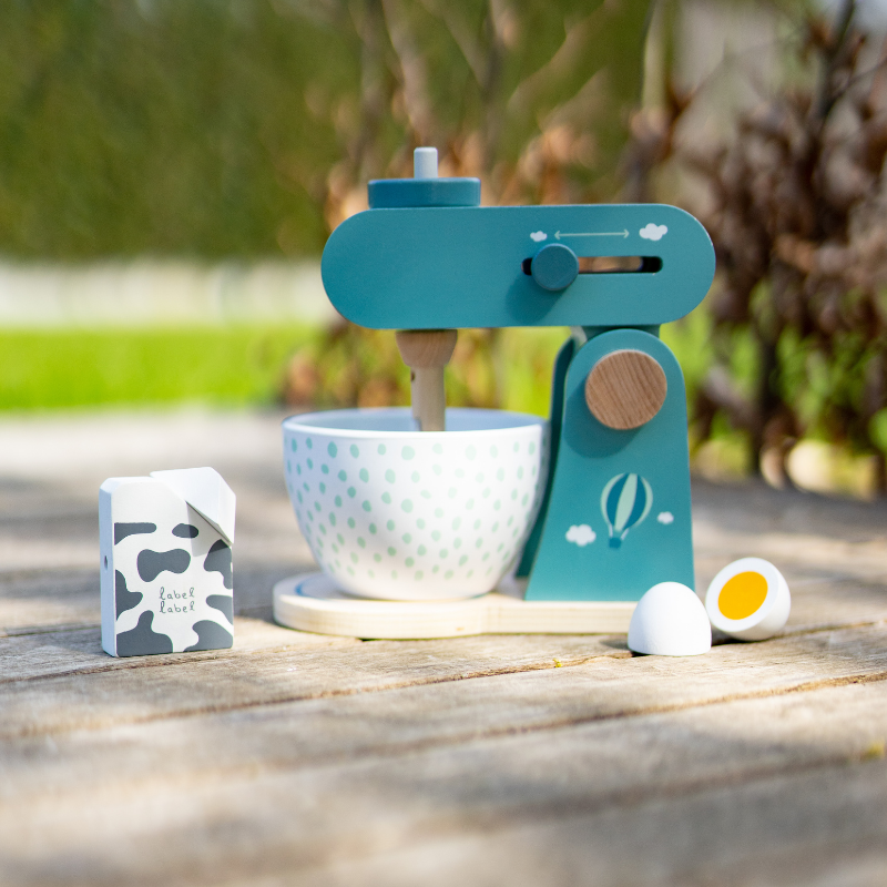 Kuhinjski mikser s dodacima, napravljen je od kvalitetnog FSC certificiranoga drveta i obojen bojama na bazi vode te ukrašen simbolima. Savršena ideja za igru naših malih kuhara i slastičara.