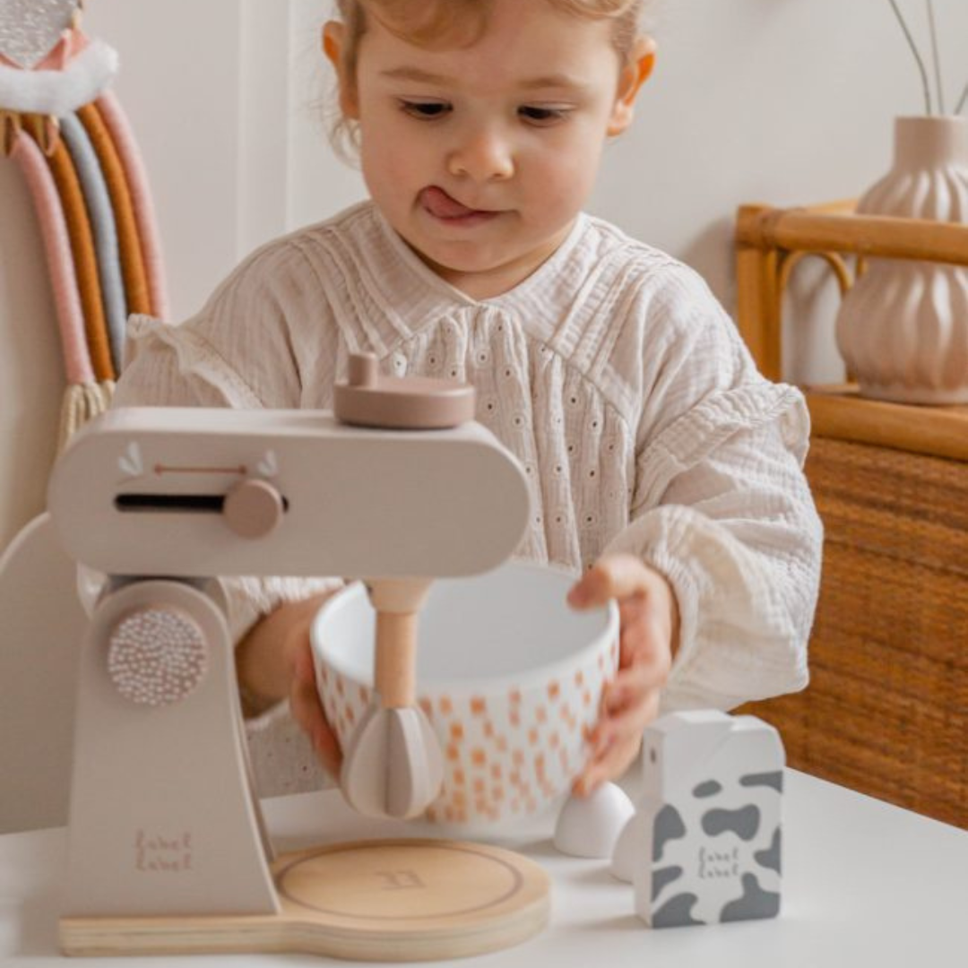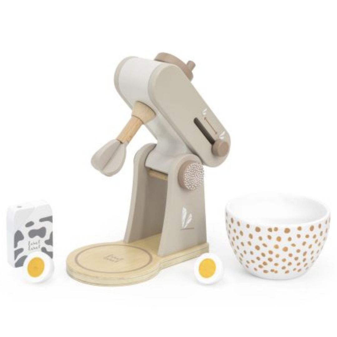 Kuhinjski mikser s dodacima, napravljen je od kvalitetnog FSC certificiranoga drveta i obojen bojama na bazi vode te ukrašen simbolima. Savršena ideja za igru naših malih kuhara i slastičara.