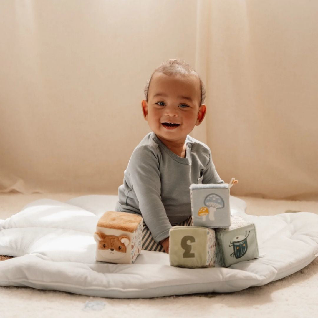 Zvonite, zveckajte i okrećite! Uz razne zvukove, teksture i značajke koje možete istražiti, ovaj zabavni set mekih kockica zabavljat će vaše dijete. Osim toga, potiče koordinaciju ruku i očiju. Veseli set sastoji se od 4 multi-senzorskih kocaka, od kojih je svaka definirana nježnim bojama i ukrašena jedinstvenim brojem. Dječje ruke otkrit će i naše šarmantne naljepnice, plišane tanjure i ogledalo. Kombinirajte s drugim igračkama iz naše kolekcije Forest Friends za koordiniranu igru.