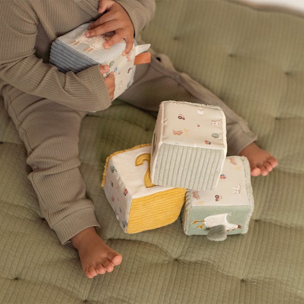 Zvonite, tresite i mašite! S različitim zvukovima, teksturama i funkcijama koje se mogu istraživati, ovaj zabavan set mekanih kocki će zabavljati vašu bebu. Osim toga, potiče koordinaciju između ruku i očiju. Ovaj veseli komplet sastoji se od 4 vise senzorske kocke, pri čemu svaka ima meke boje i jedinstveno ukrašenu brojkom. Bebine ruke će također otkriti naše šarmantne naljepnice, plišane pločice i sunčano ogledalo. Kombinirajte ih s drugim igračkama iz naše kolekcije Little Farm za usklađenu igru.