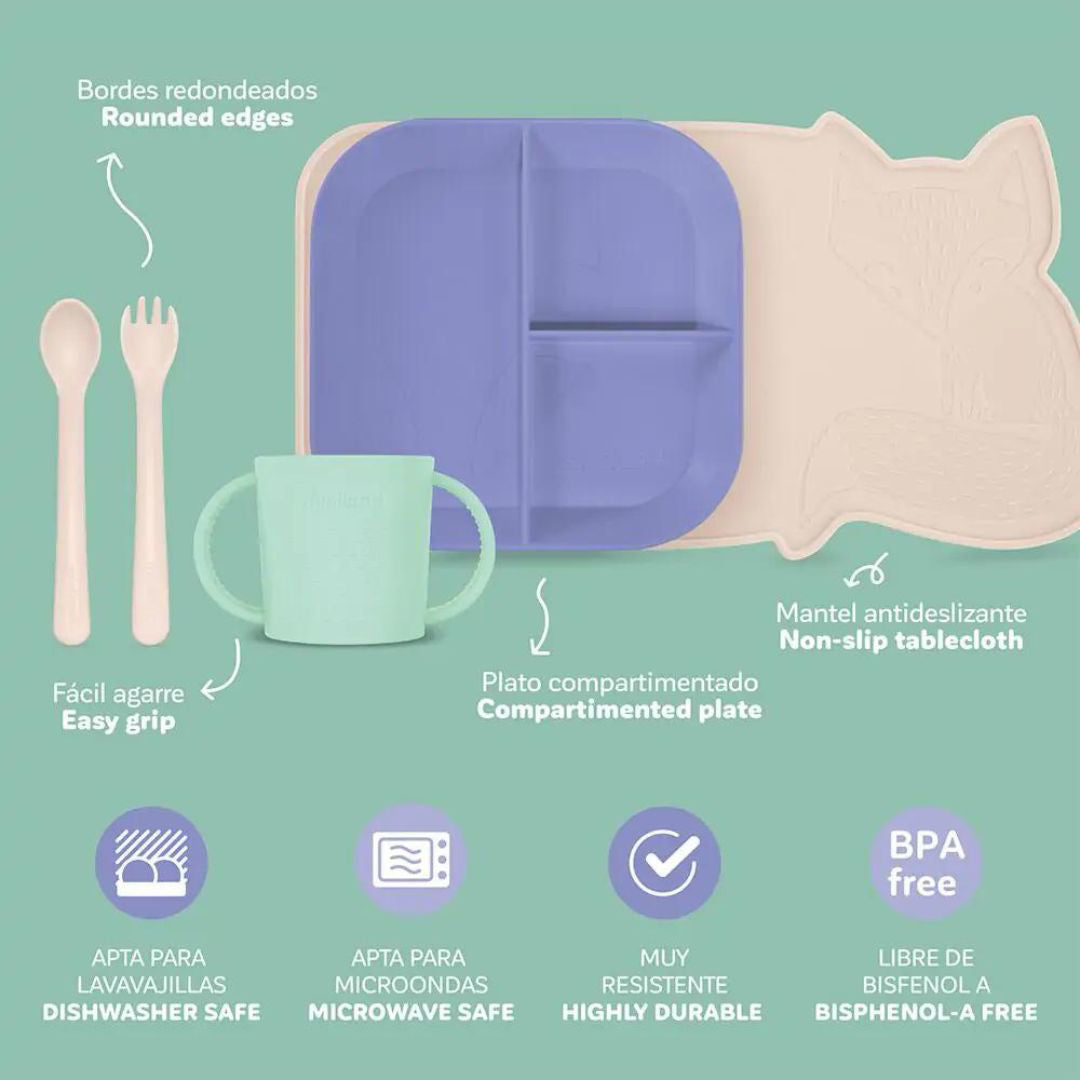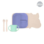 Ovaj prekrasni BLW set za hranjenje ističe se svojom zabavnom kombinacijom boja i funkcionalnim dizajnom. Uključuje protukliznu podlogu, tanjur s tri odjeljka za odvajanje različitih namirnica, pribor za jelo sa zaobljenim rubovima za sigurnu upotrebu i šalicu prilagođenu malim rukama, idealnu za poticanje neovisnosti. Osim toga, može se prati u perilici posuđa i mikrovalnoj pećnici, što ga čini savršenim izborom za izvođenje Baby Led Weaning (BLW).