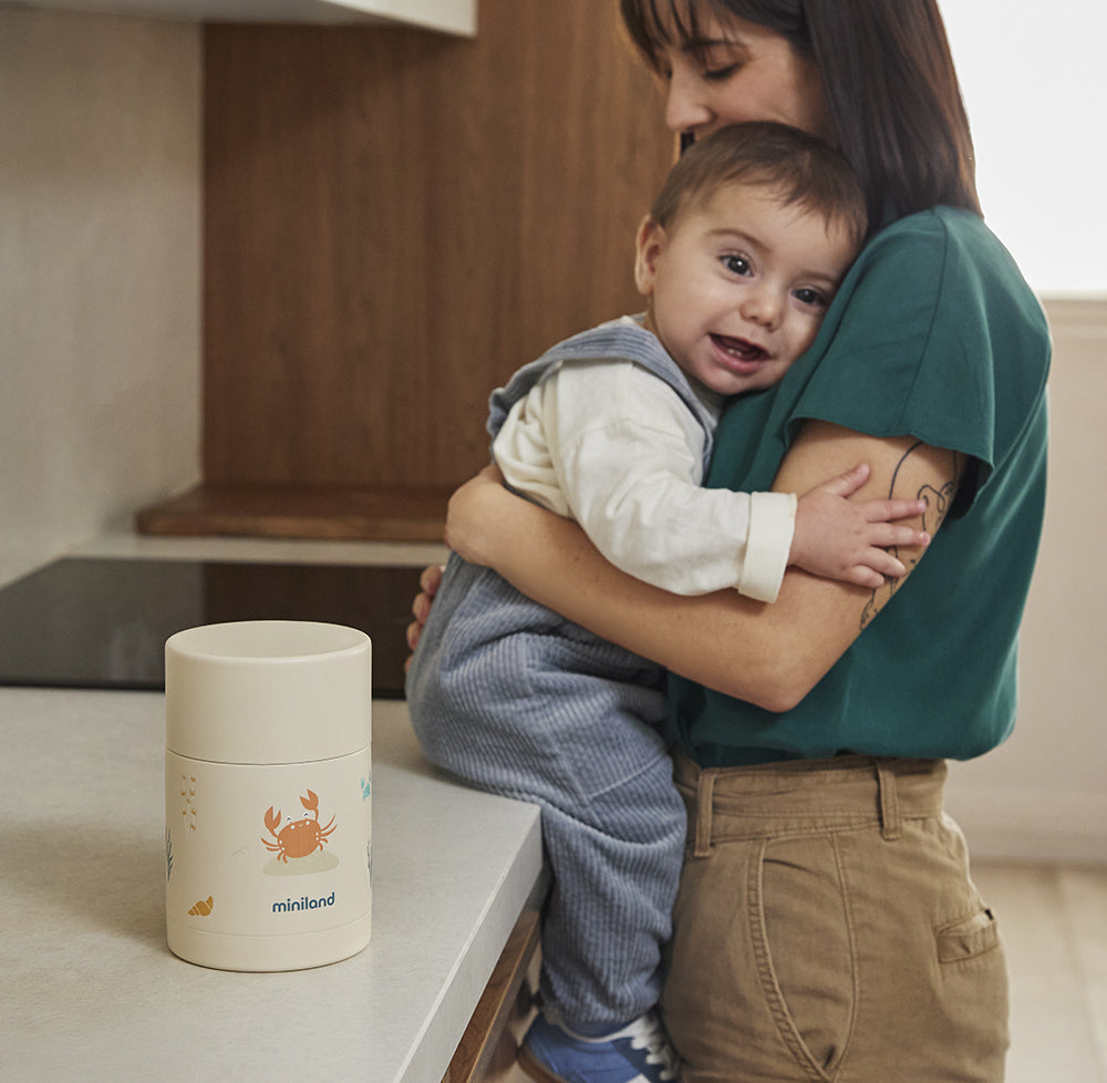 Miniland® termos za čvrstu hranu i kašice od 600 ml savršeno je rješenje za održavanje temperature dječje hrane kod kuće ili na putu. Zahvaljujući dvostrukoj stijenki od nehrđajućeg čelika i posebnom sloju aluminija, učinkovito održava toplinu ili svježinu hrane više od 12 sati. Vanjska površina s mekanim gumiranim slojem čini ga ugodnim za držanje i otpornim na udarce.