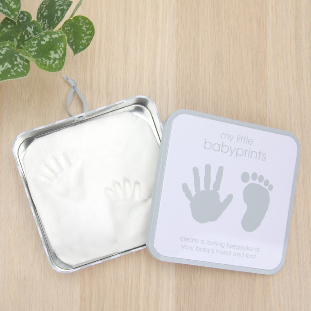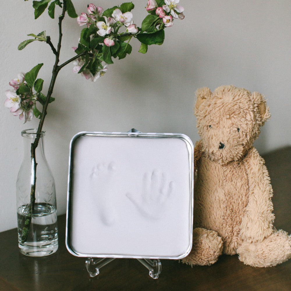 Mekana siva kutija dolazi s paketom gline, valjkom i stalkom za izlaganje kada se napravi otisak. Sve je pohranjeno u ovoj prekrasnoj kutiji koja je savršen poklon za roditelje koji čekaju bebu! Što je najbolje, glinu ne treba miješati niti peći!