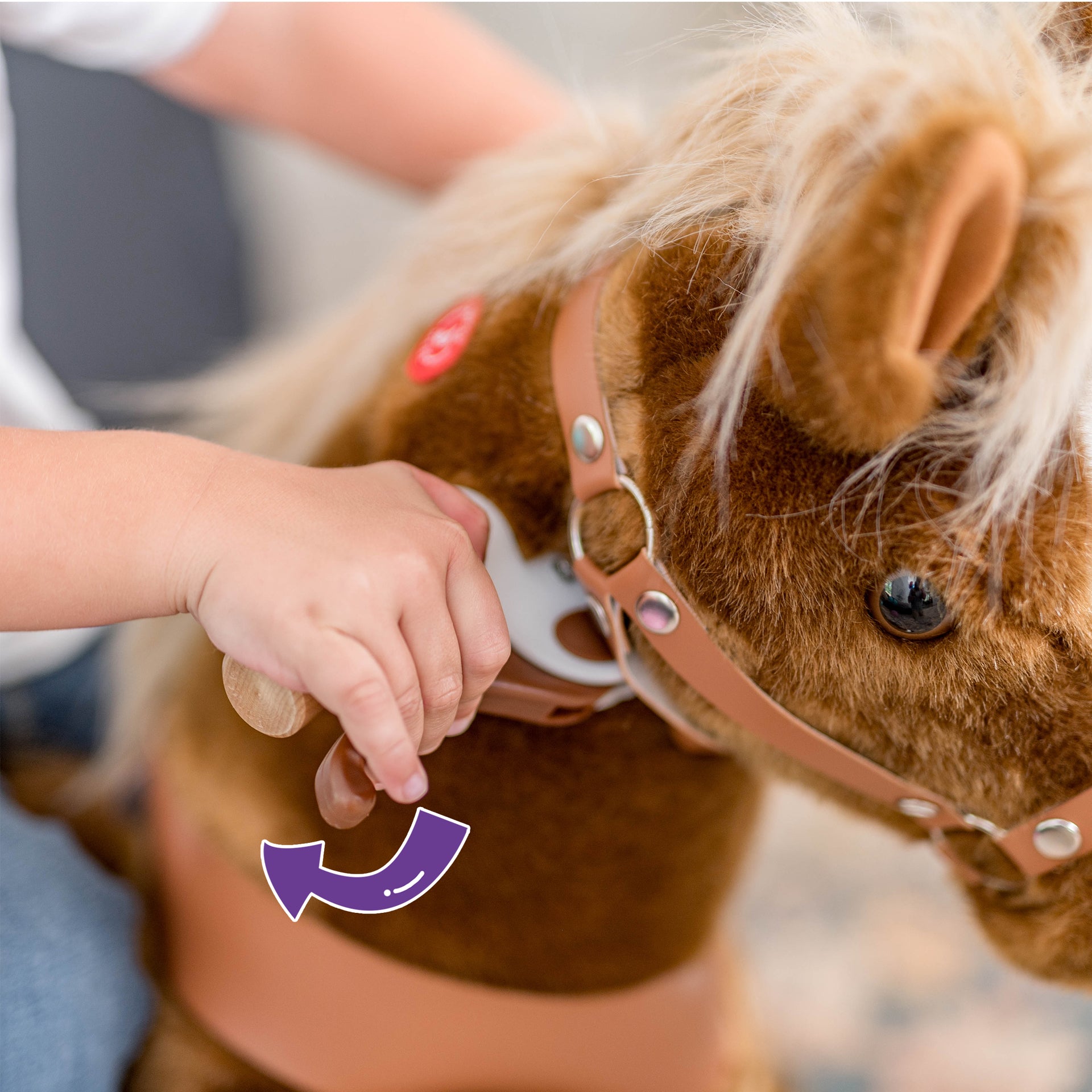 PonyCycle® Ride On ima sjedalo i pojas od umjetne kože. Griva i rep se mogu češljati, tako da djeca mogu njegovati ponija tijekom igre.