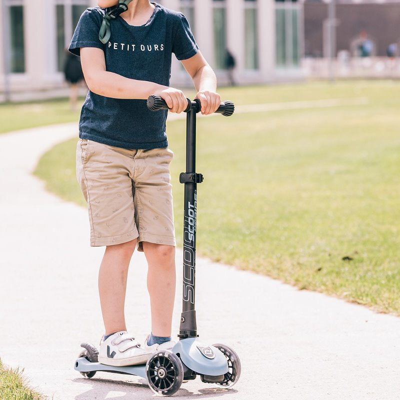 Dječji romobil Scoot & Ride model Highwaykick 3 LED je primjeran od 3. godine starosti nadalje. Podesiv upravljač omogućava da romobil raste skupa s djetetom. Sklopiva upravljačka ručica ergonomsko se prilagođava veličini tijela i omogućuje lak transport proizvoda. Jedinstveno postolje od silikona omogućava dobro prianjanje i sigurnu vožnju. Kotači imaju ugrađene LED svjetla koja tijekom vožnje svijetle. Kvalitetan premaz u boji štiti romobil od hrđe i istovremeno stvara zabavni izgled romobila.
