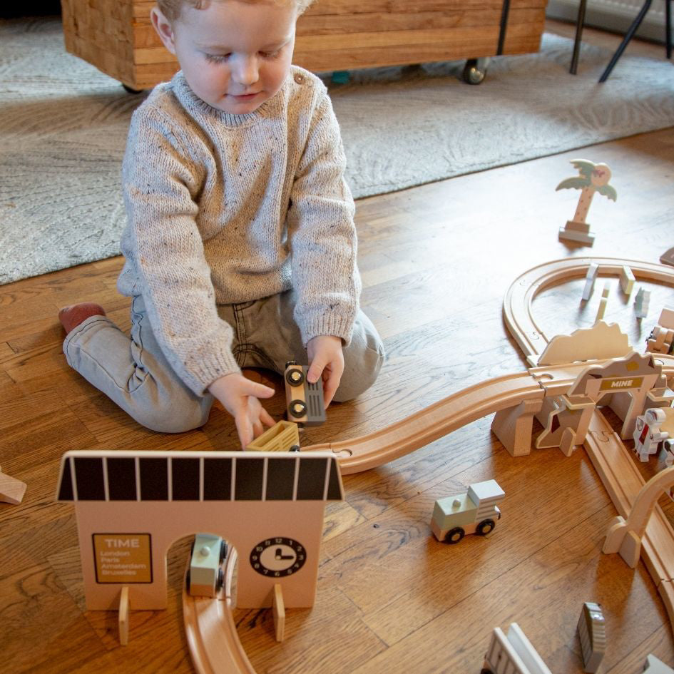 Drveni set željezničkog kolodvora pruža sate i sate zabave! Maleni će uživati u maštovitoj igri i vježbanju svoje motorike.