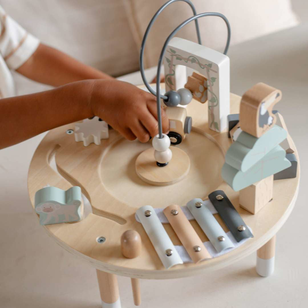 Stol nudi razne mogućnosti igre: djeca mogu voziti autić, svirati na ksilofonu, slagati slagalicu, pomicati kocke i zupčanike ili se zabavljati sa spiralom s kuglicama. Svaka aktivnost potiče različite vještine i omogućuje sate zabavne igre.