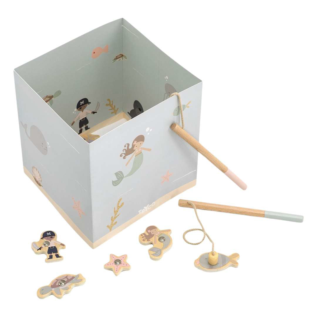 - Contenuto: 13 figure in legno, 2 canne da pesca magnetiche, acquario in cartone
