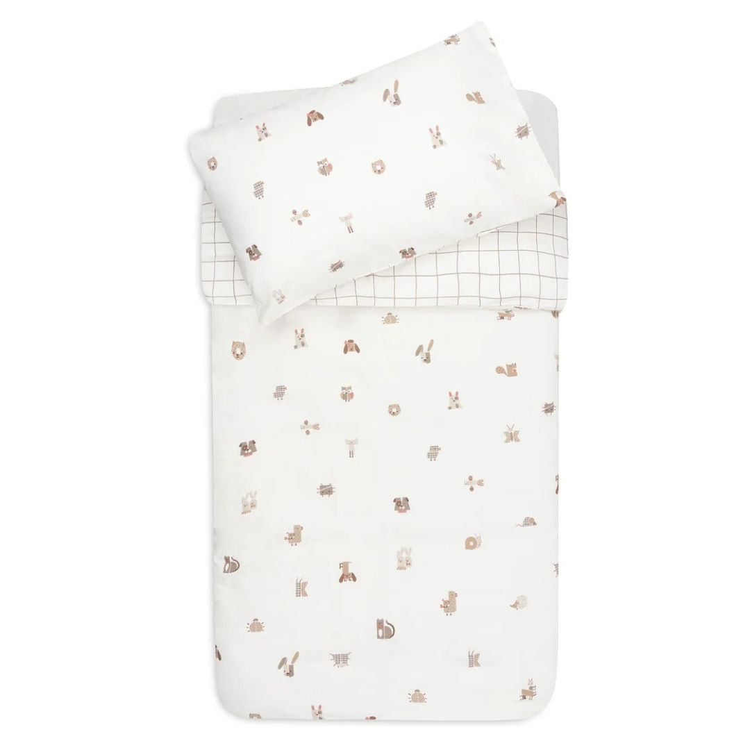 Ta prikupen posteljni komplet Animal Friends pričara veselo in toplo vzdušje v vsaki otroški sobici. Zgornja stran prevleke ima čudovit potisk Animal Friends na nežni barvi ovsa, spodnja stran pa je okrašena z drobnim karo vzorcem v odtenkih ovsa in temno olivno zelene. Zahvaljujoč obojestranskemu dizajnu lahko videz posteljice hitro in enostavno osvežite.