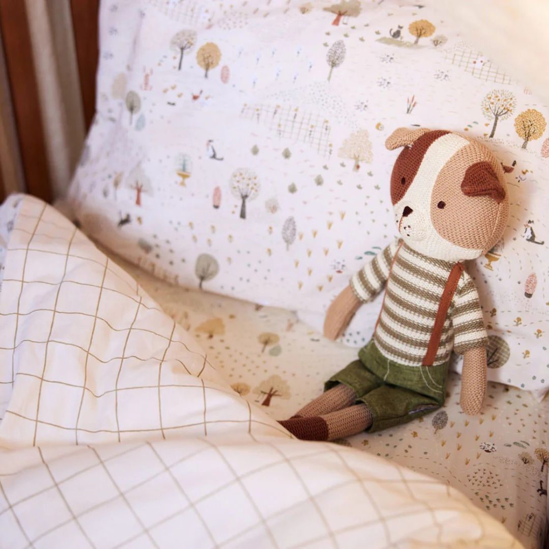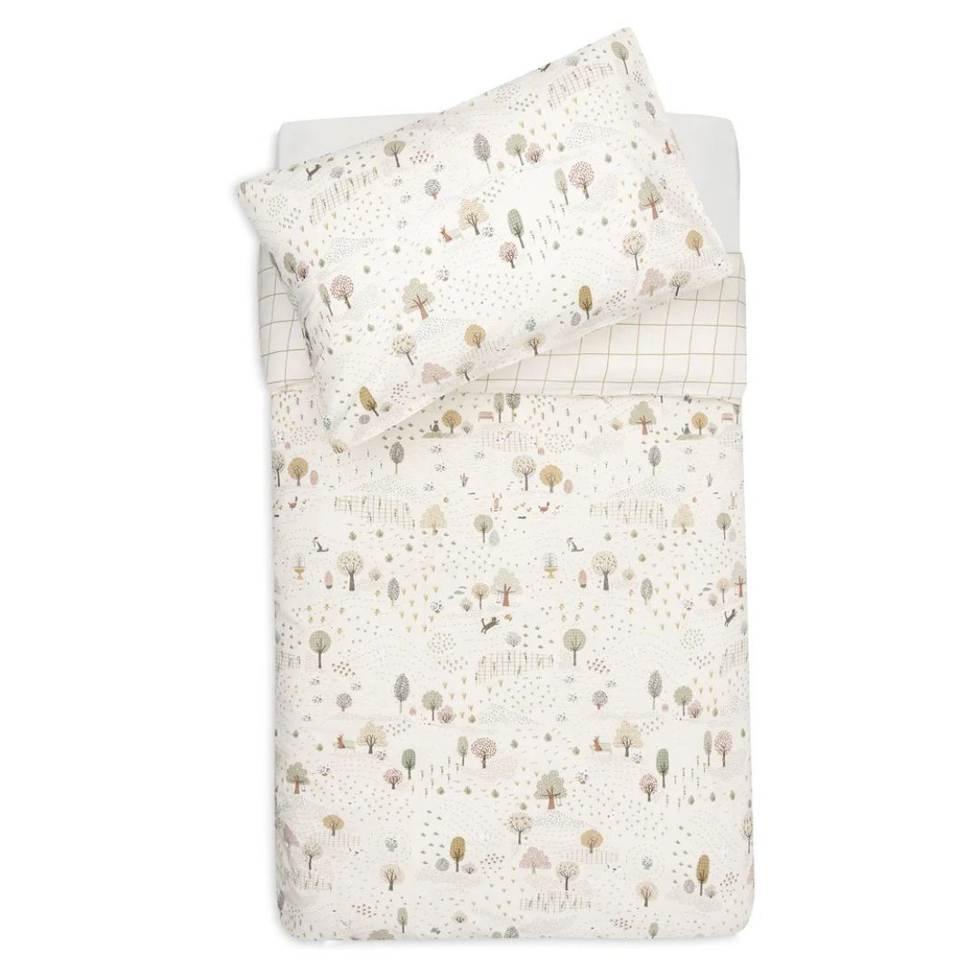 Dodajte pridih udobja in topline otroški sobici s tem prikupnim posteljnim kompletom Tiny Park. Zgornja stran prevleke ima živahen potisk po celotni površini, medtem ko je hrbtna stran okrašena s čudovitim karo vzorcem v odtenkih ovsa in temno olivne.